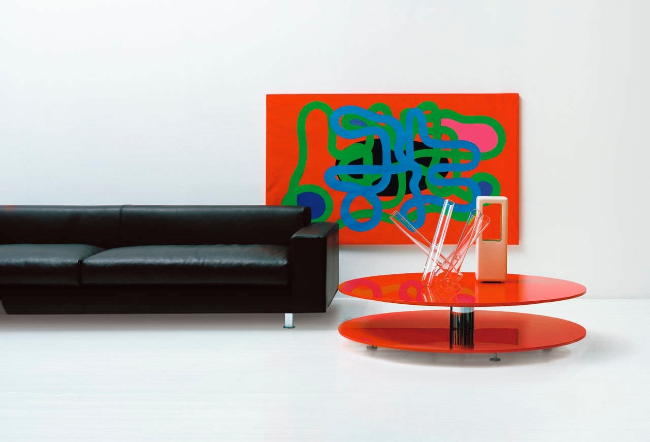 圆形咖啡桌由两个木制台面亚光或抛光漆组成,可提供所有颜色的系列,通过抛光镀铬钢柄连接。