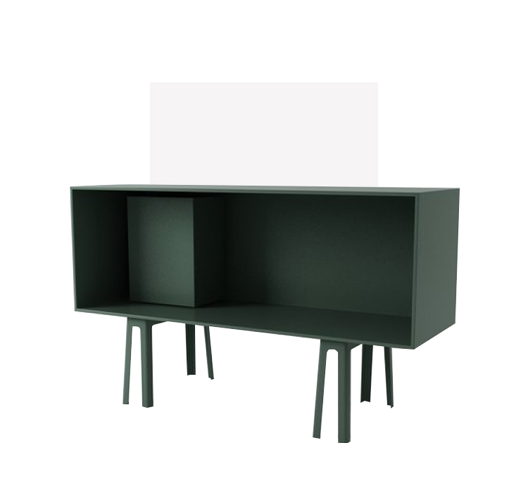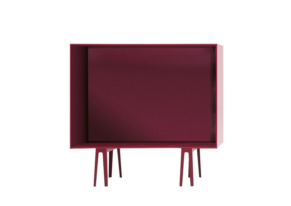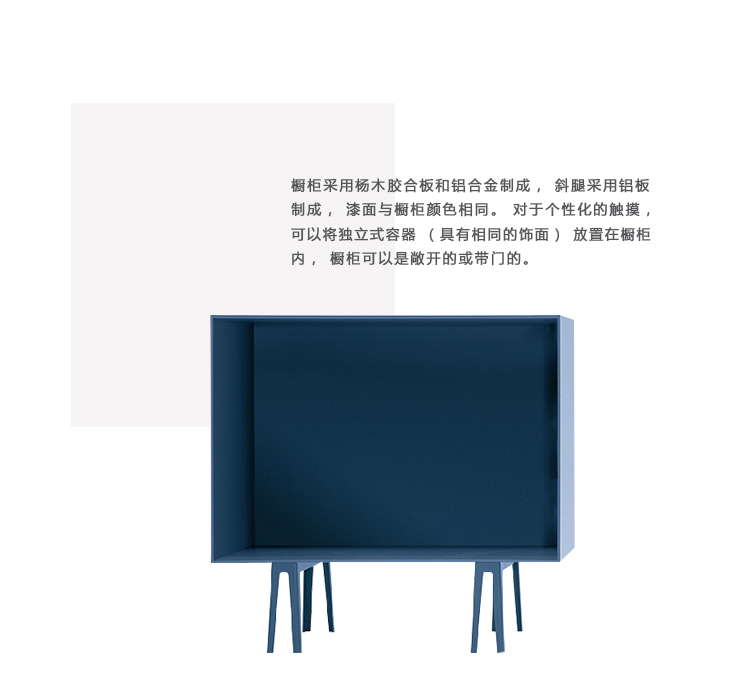 橱柜采用杨木胶合板和铝合金制成,斜腿采用铝板制成,漆面与橱柜颜色相同。 对于个性化的触摸,可以将独立式容器(具有相同的饰面)放置在橱柜内,橱柜可以是敞开的或带门的。