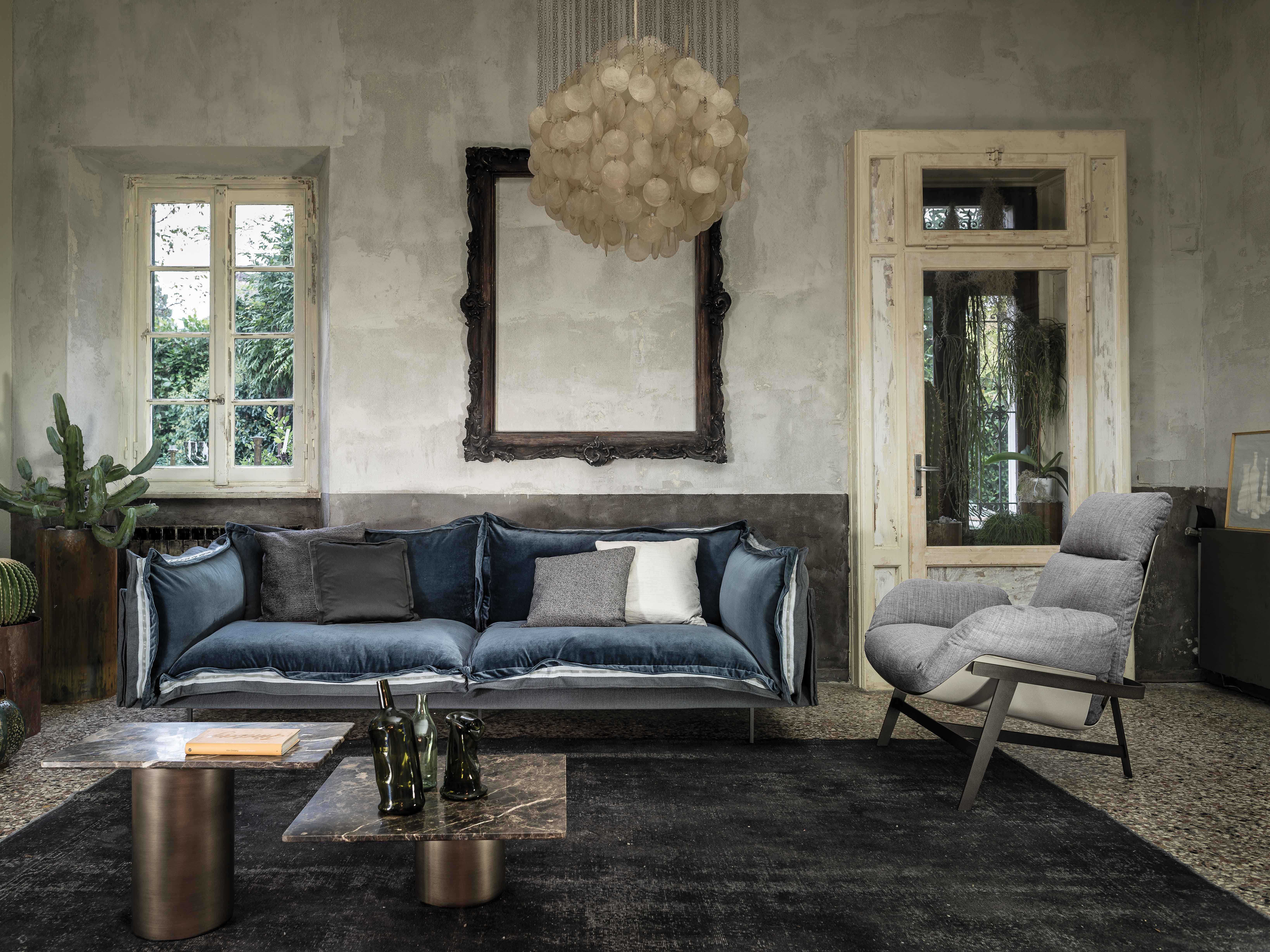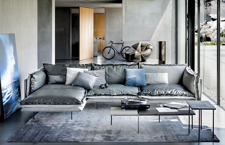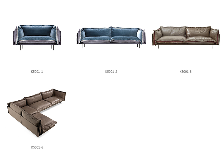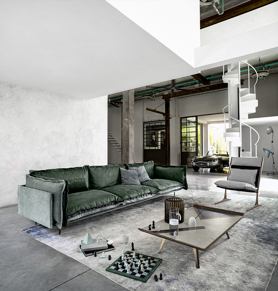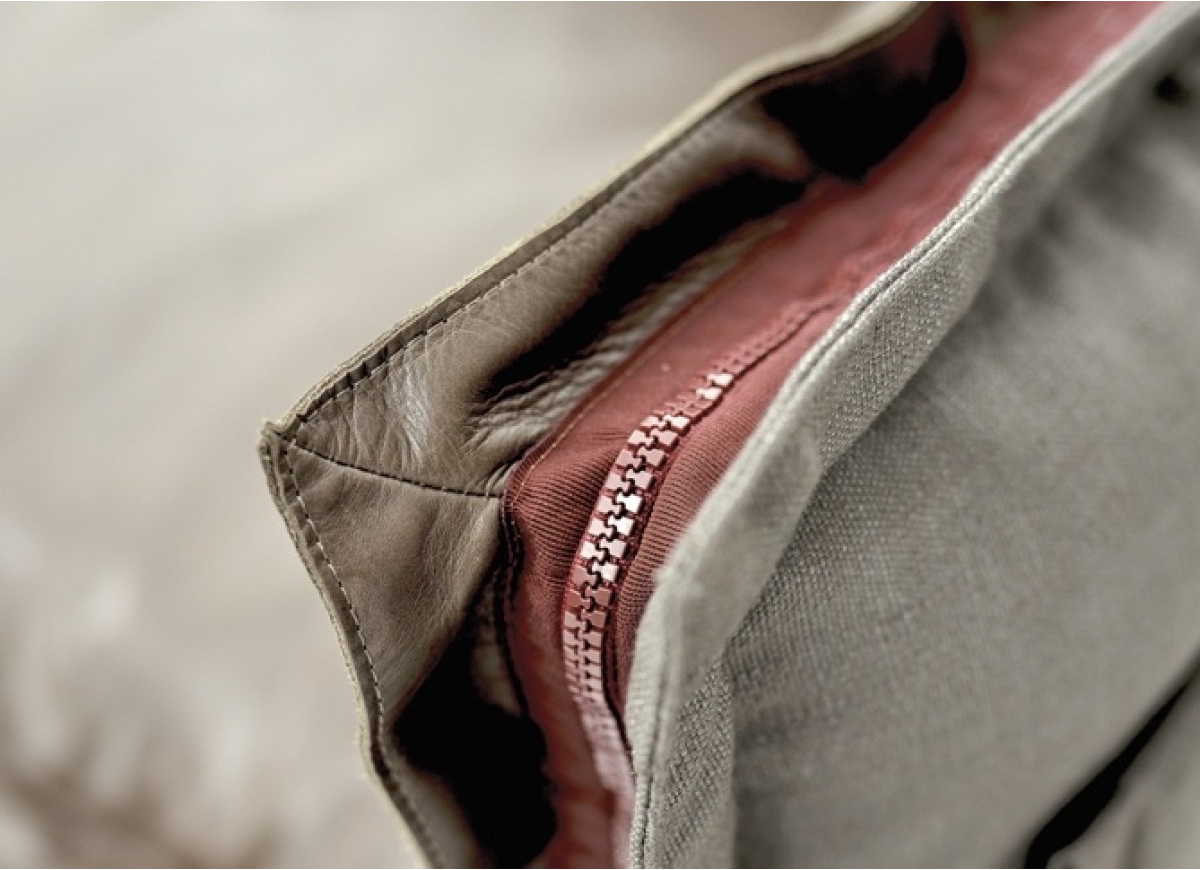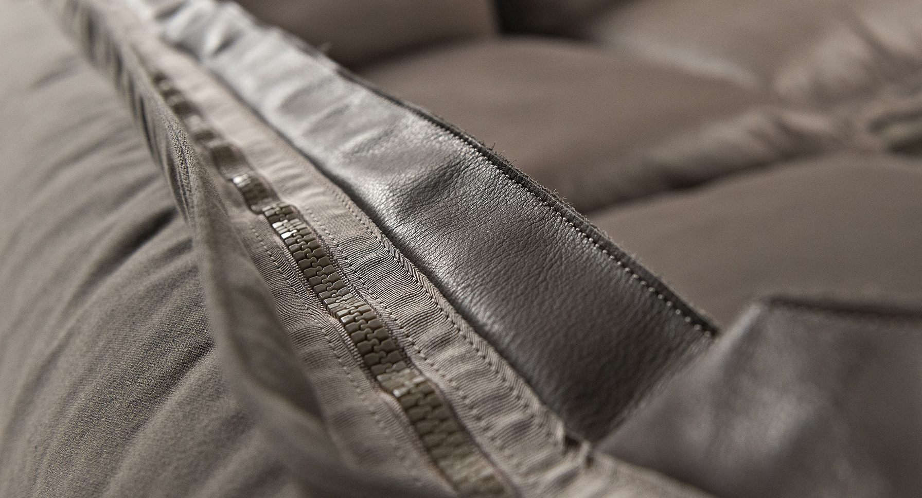 The important zip, applied to the four sides of the cushions, fastens the two-sided cover, one in leather and one in fabric, gives rigour to the sofa and underlines its peculiar design. The result is a sofa in which the softness and warmth of the fabric coexists with the elegance of leather. A peculiar mix of materials to create different chromatic combinations and sophisticated matches. The structure seems to float above the ground thanks to the thin, minimal feet made of square section metal.