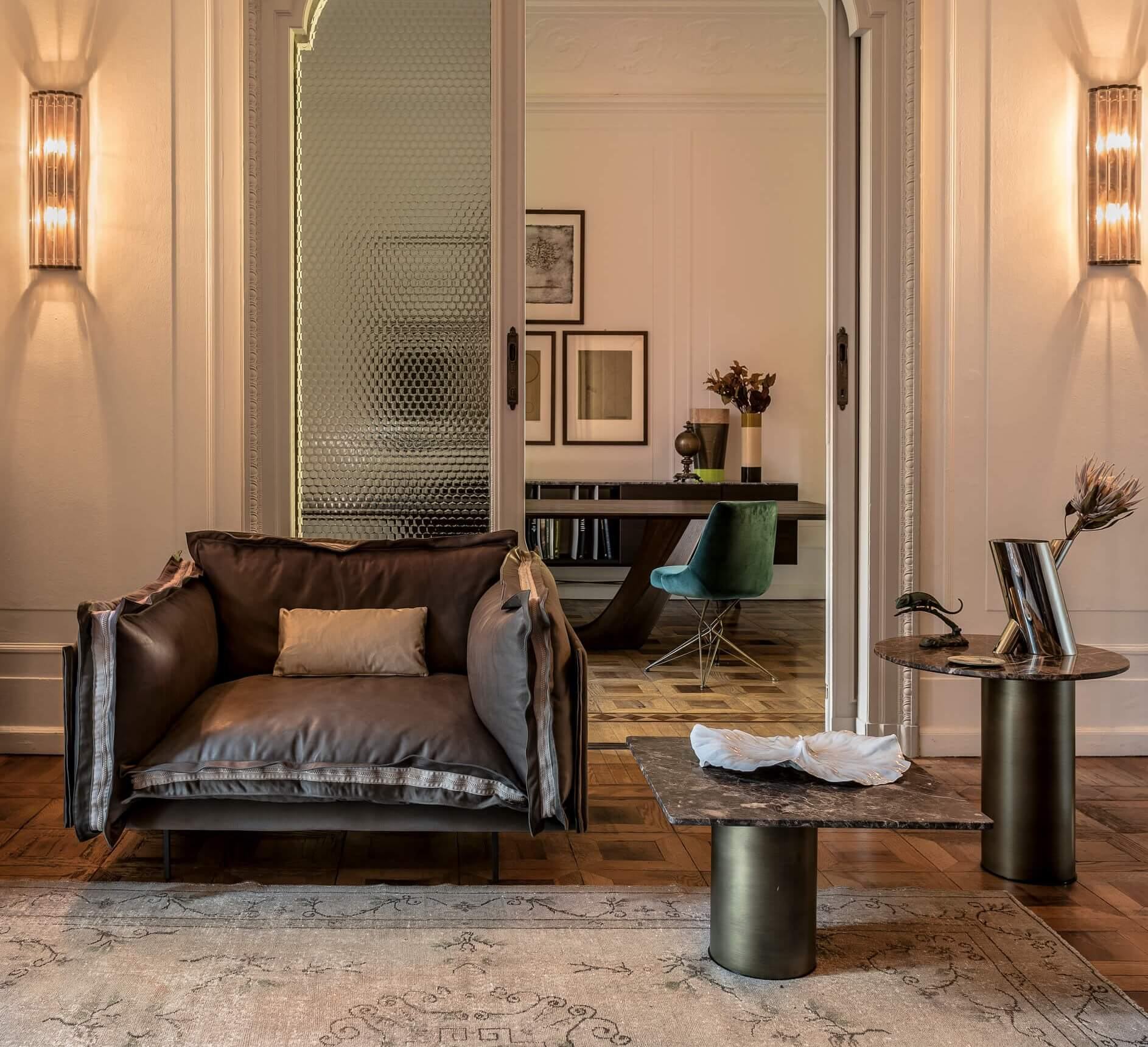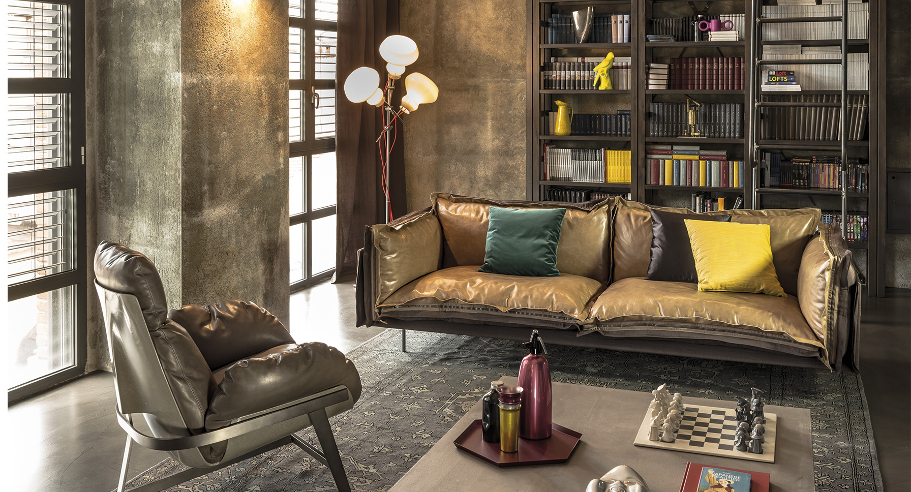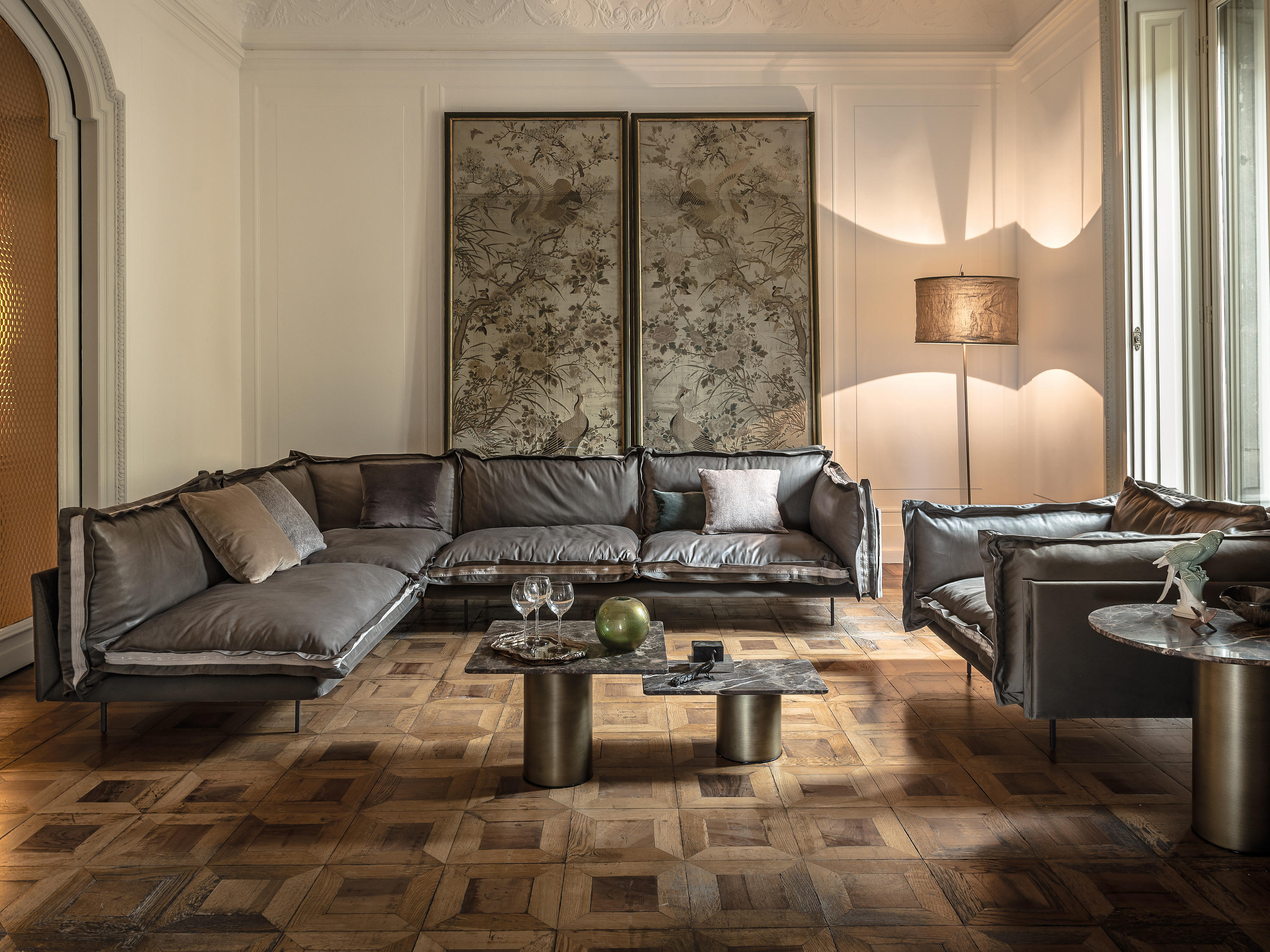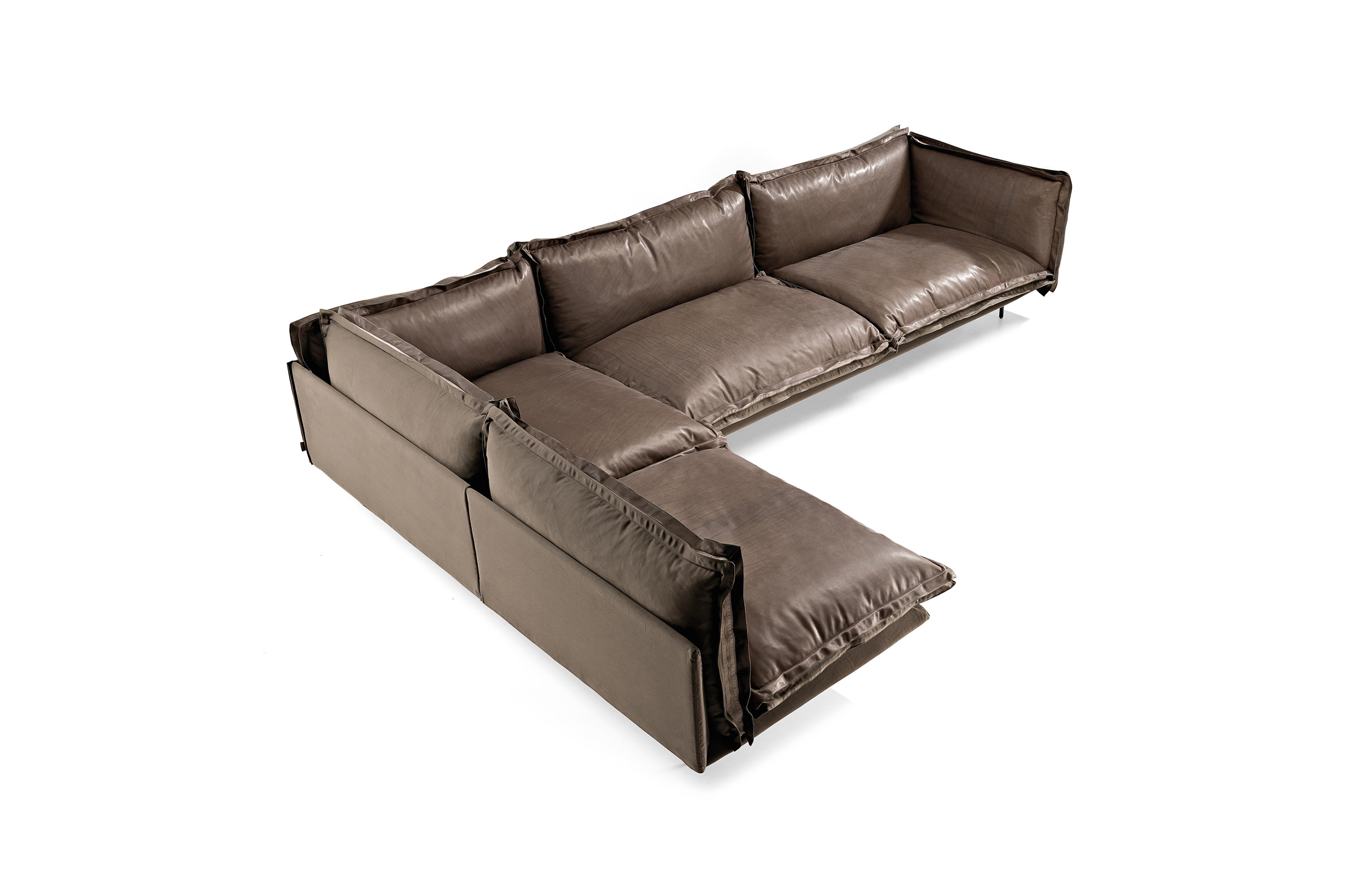 The important zip, applied to the four sides of the cushions, fastens the two-sided cover, one in leather and one in fabric, gives rigour to the sofa and underlines its peculiar design. The result is a sofa in which the softness and warmth of the fabric coexists with the elegance of leather. A peculiar mix of materials to create different chromatic combinations and sophisticated matches. The structure seems to float above the ground thanks to the thin, minimal feet made of square section metal.