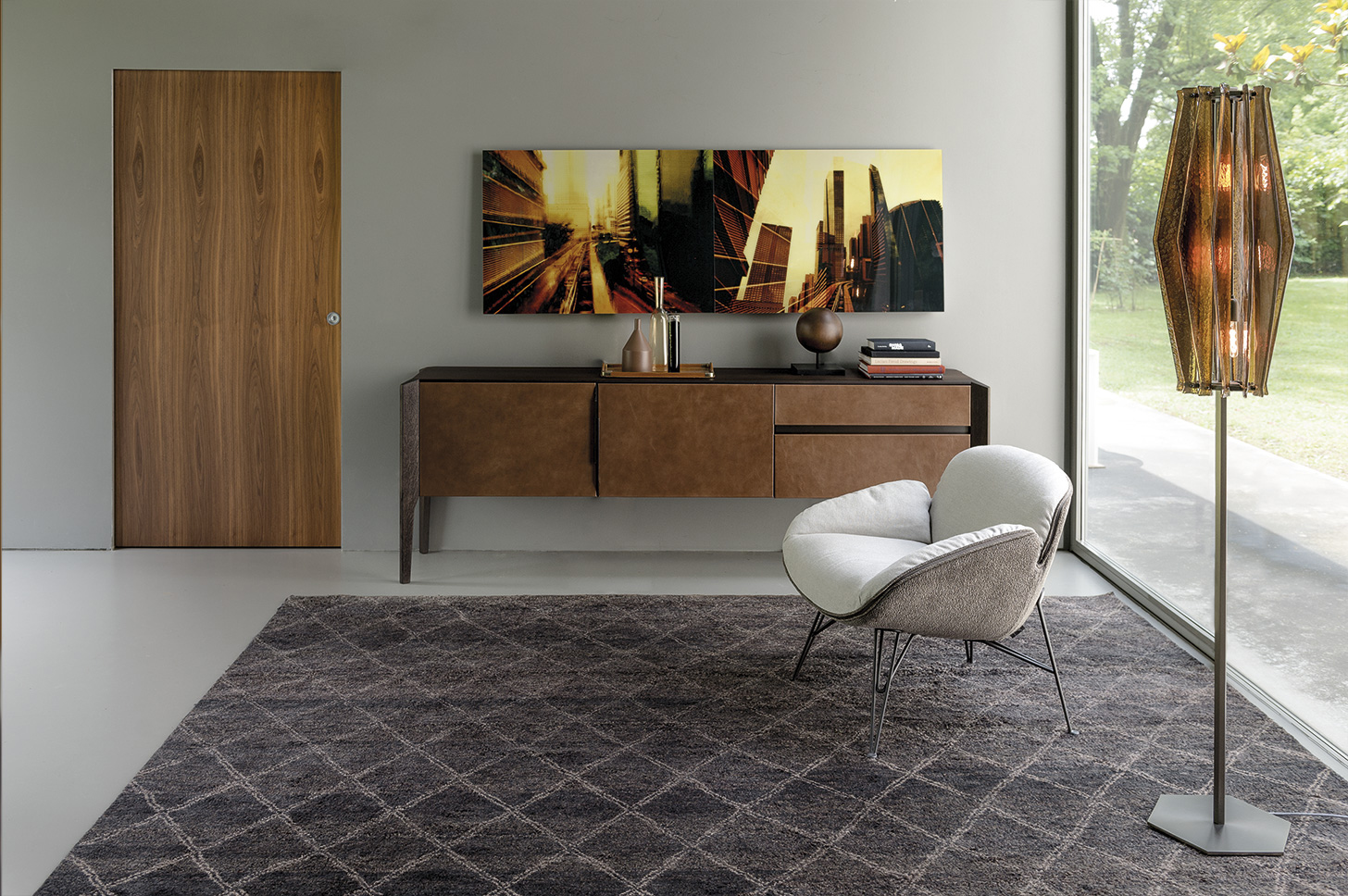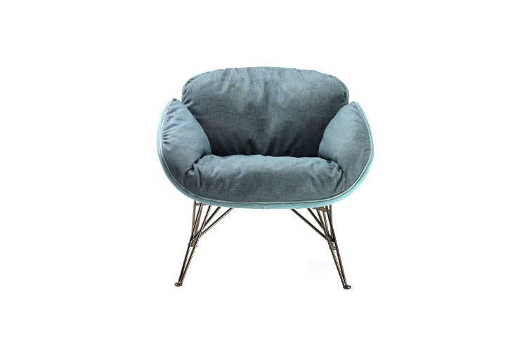 在扶手椅朱诺的背部和手臂柔软的衬垫与薄结构的严谨性形成鲜明对比。一条细长的线连接着内部和外部的部分。拉链在扶手周边区域运行,在各个部分之间创建了一个令人着迷的连接。框架由四个金属脚组成,它们构成了光的三维形态。