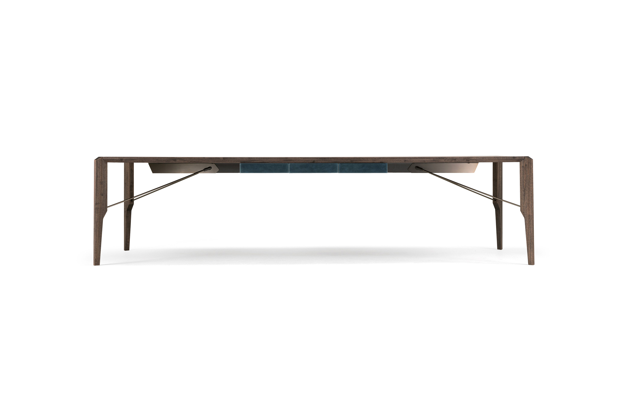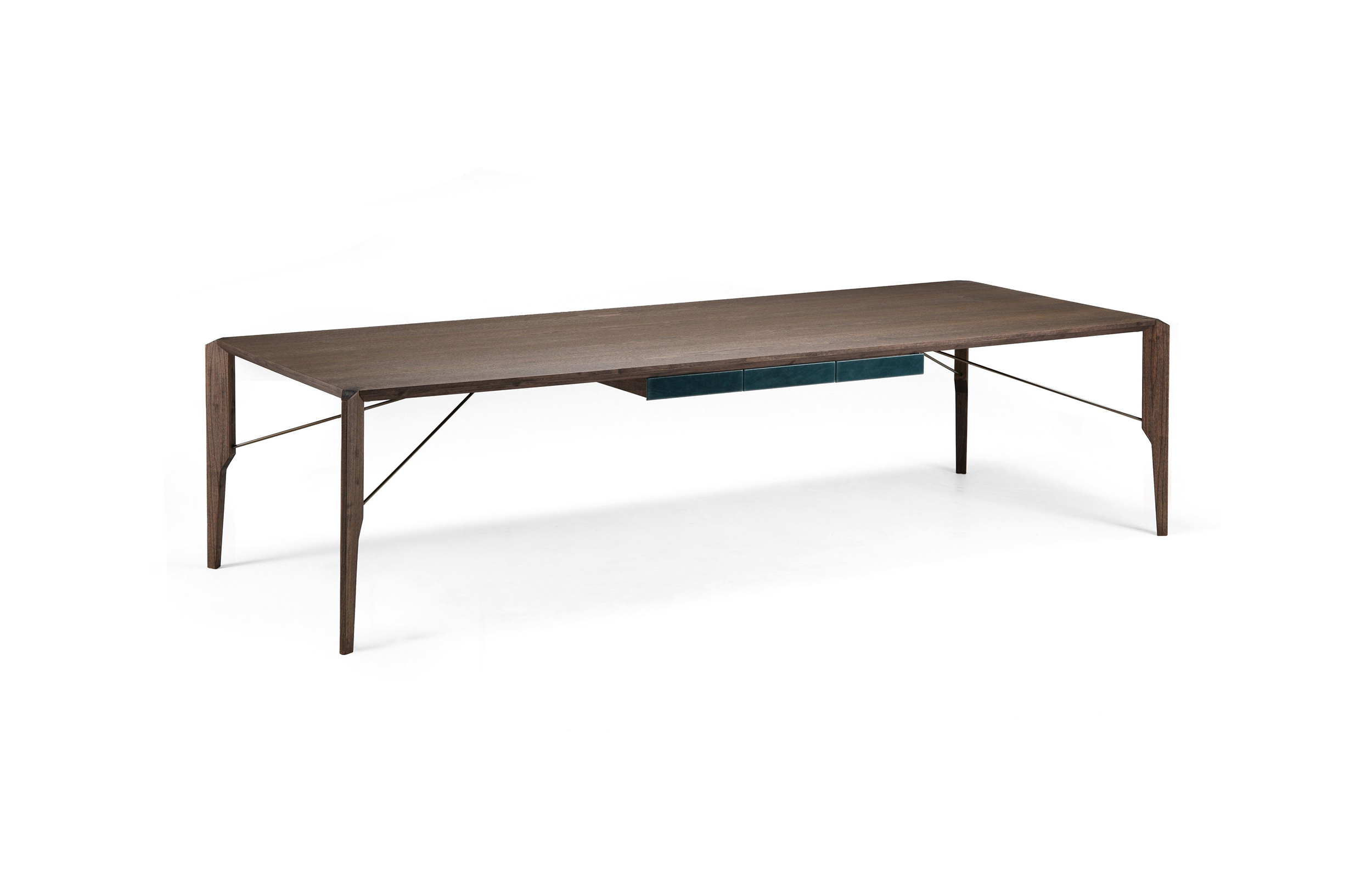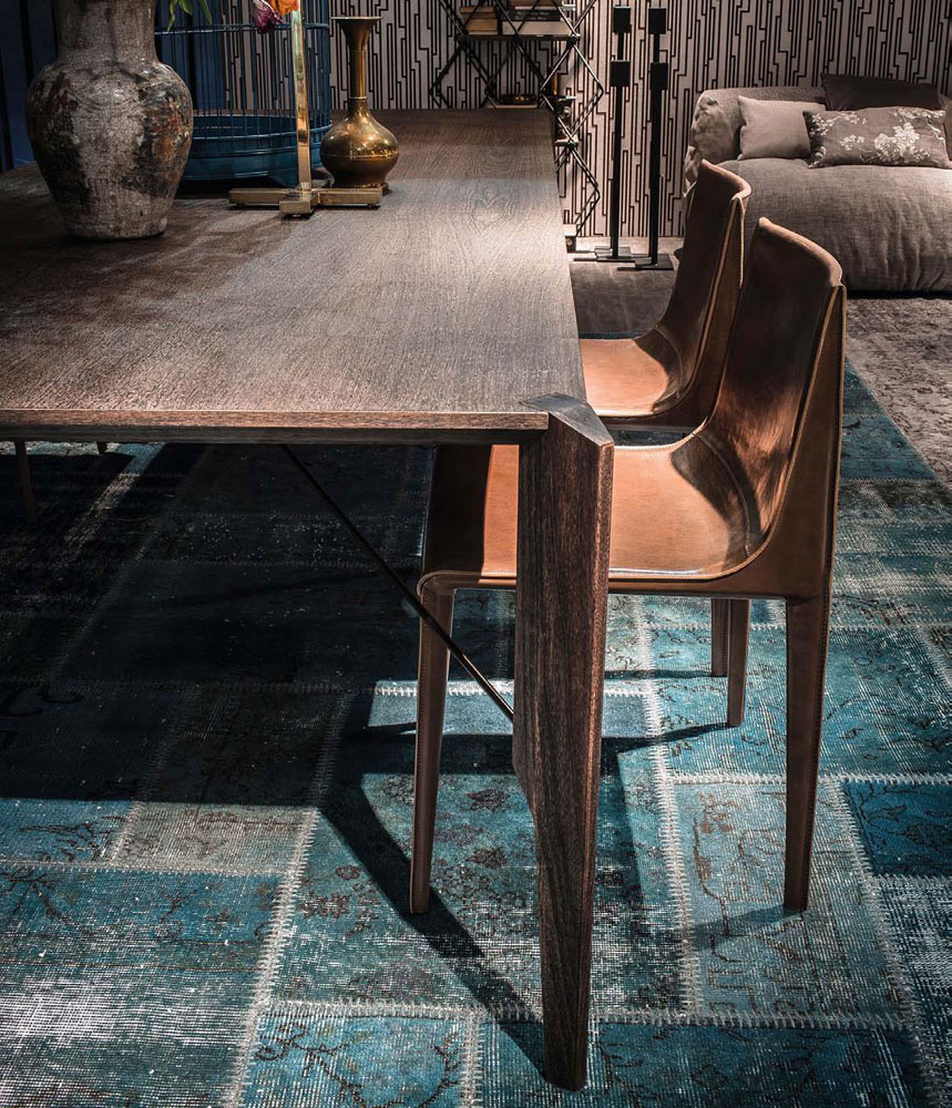 Manzoni&Tapinassi设计的Glorious餐桌运用了最基本的线条设计,以获得极度轻盈的效果。桌面可在摩卡橡木、卡纳莱托胡桃木或苏木皮拉木材中进行选择,桌面下方的抽屉上覆盖有植物鞣制的不同颜色的皮革,可以从强烈的茄皮紫和天然的灰色等各种颜色间进行选择。其独特的特点是每条桌脚上都连接着金属支柱,使其变得薄而又轻盈。