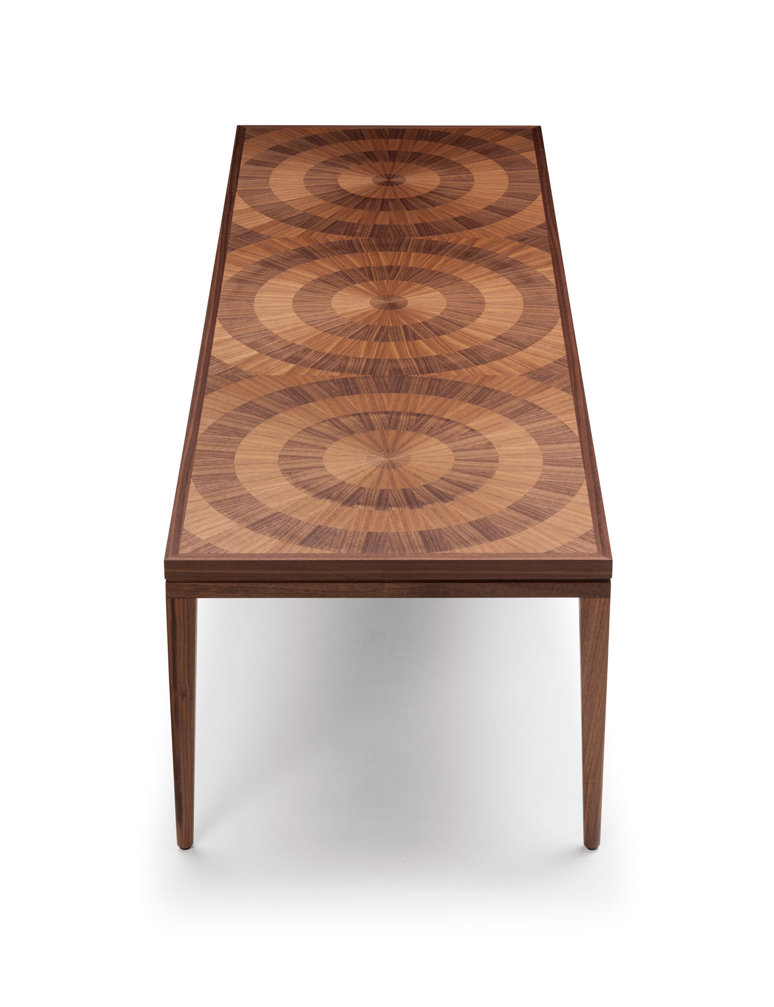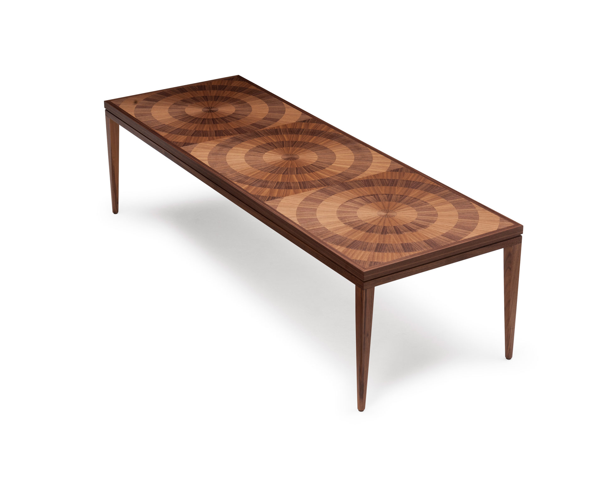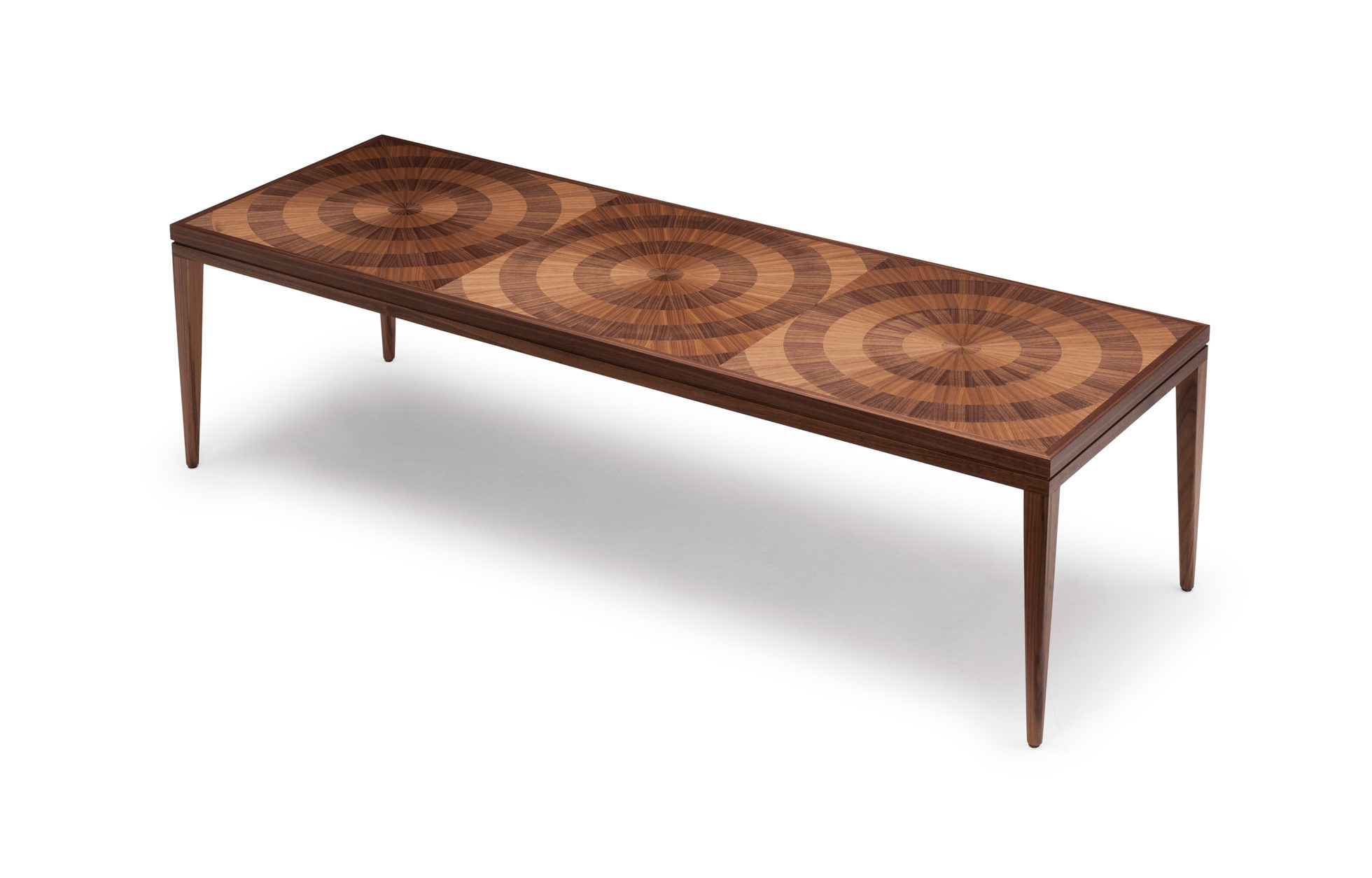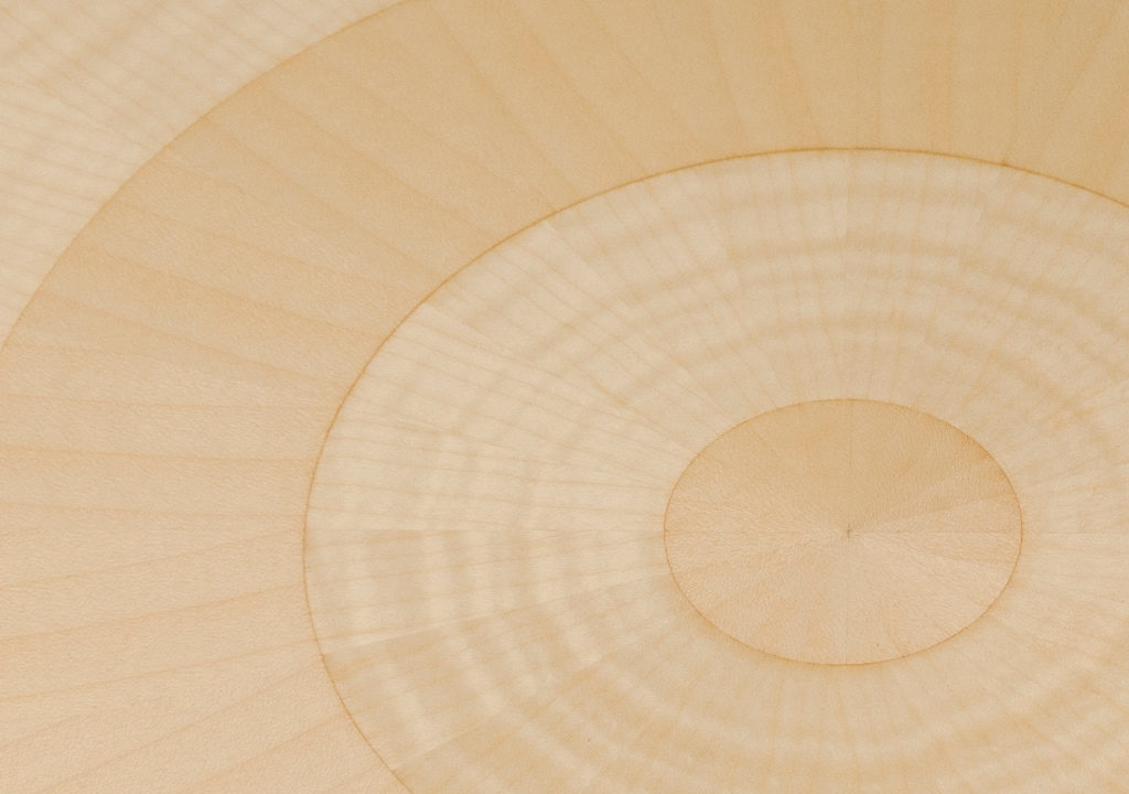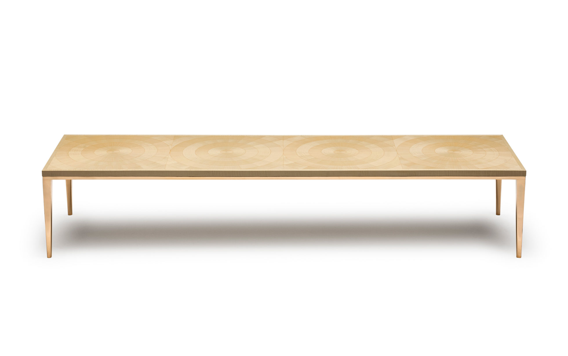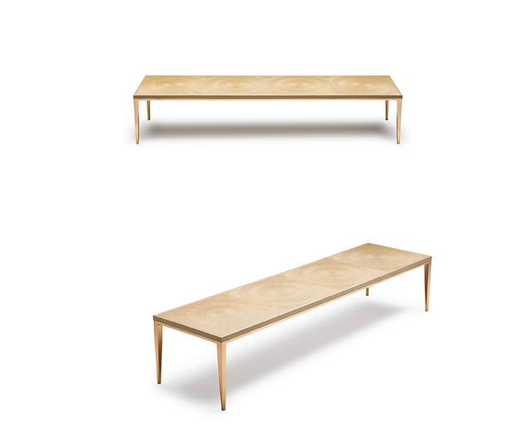 手工铺设的径向同心圆形对比色调和美国梧桐切割在坚实的抛光青铜腿上,这款特别版的Catalyst咖啡桌远远望去,而坐在附近则是错综复杂的美丽。