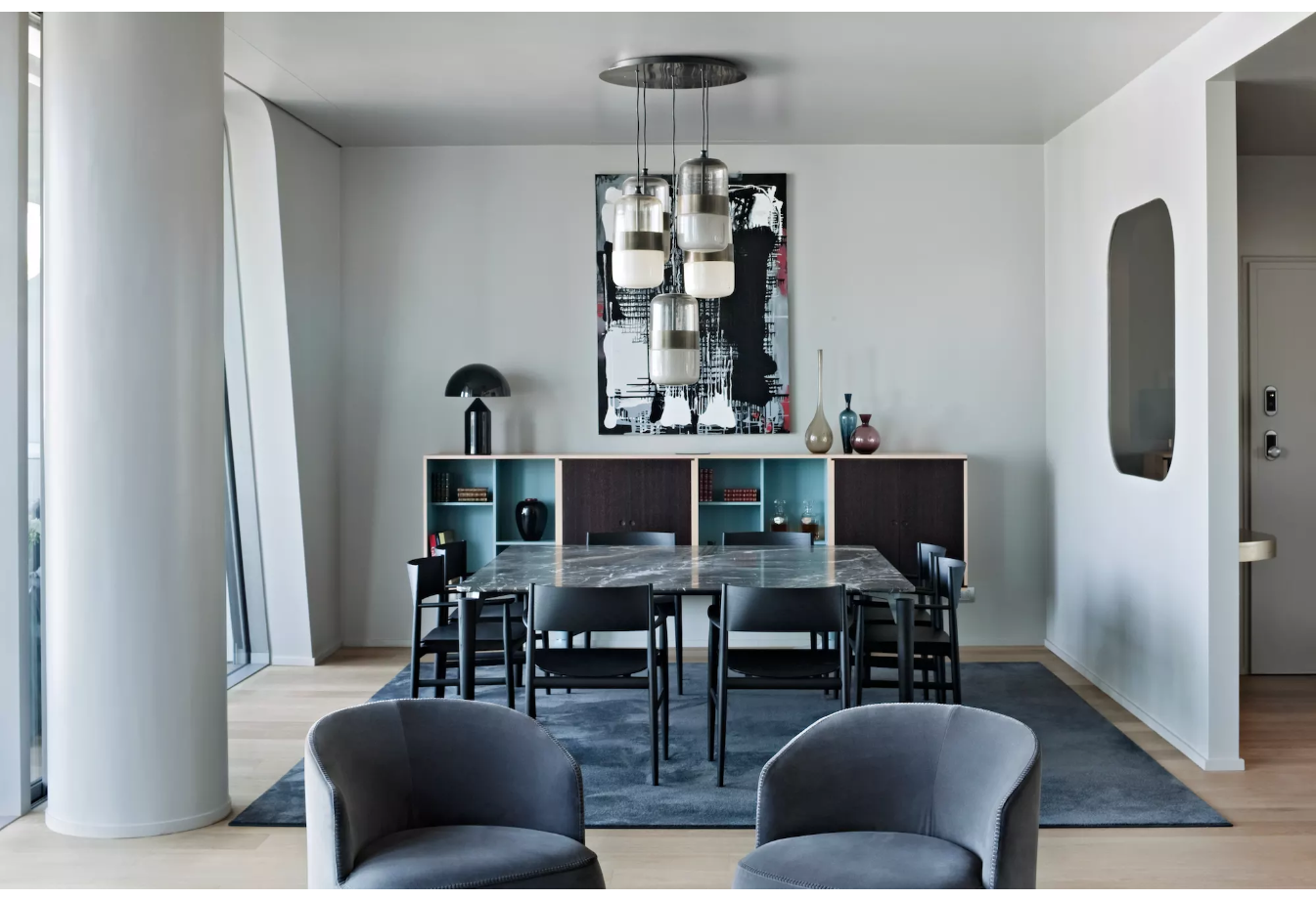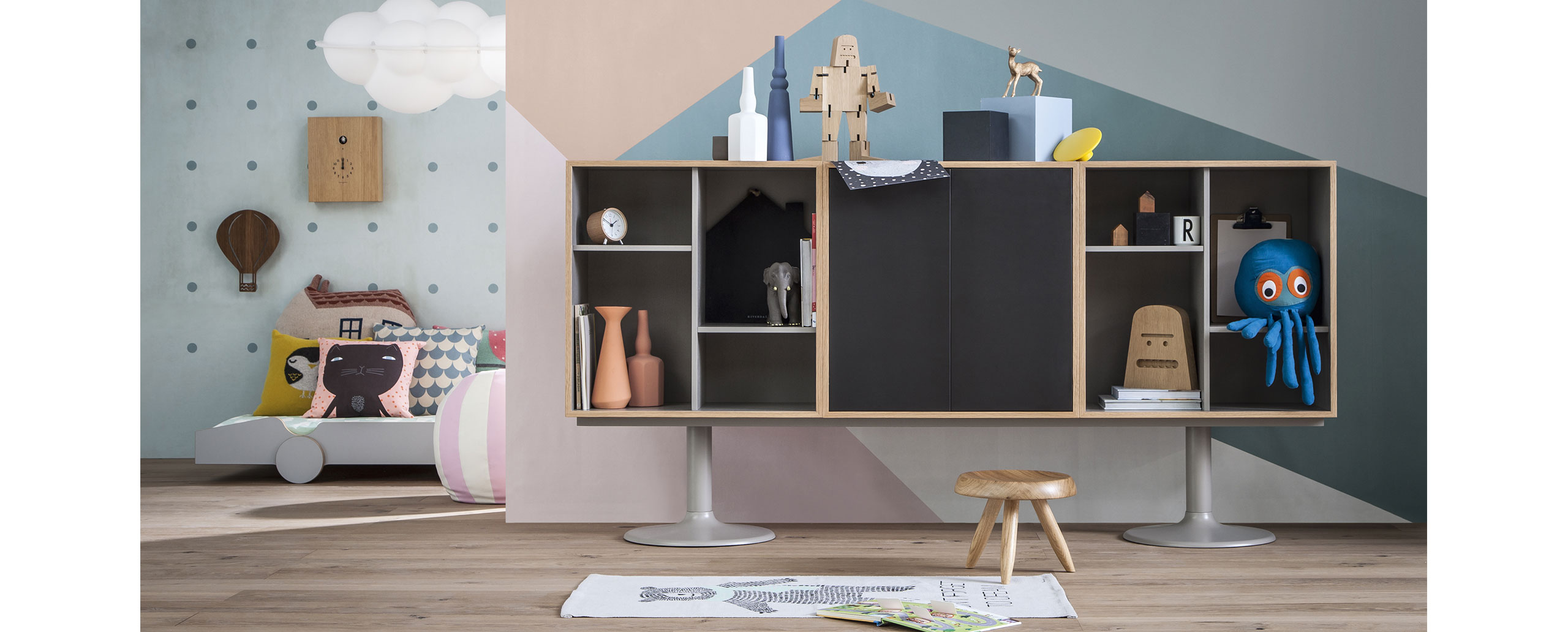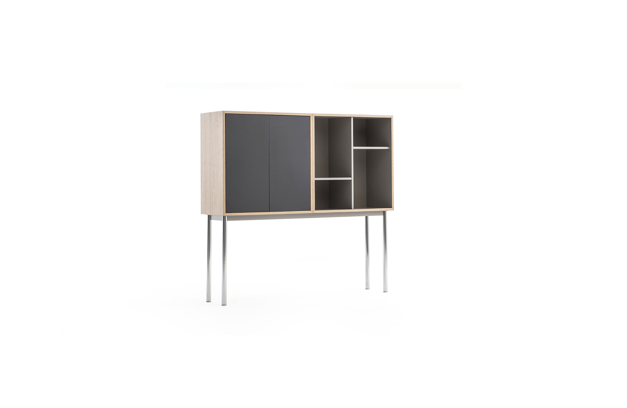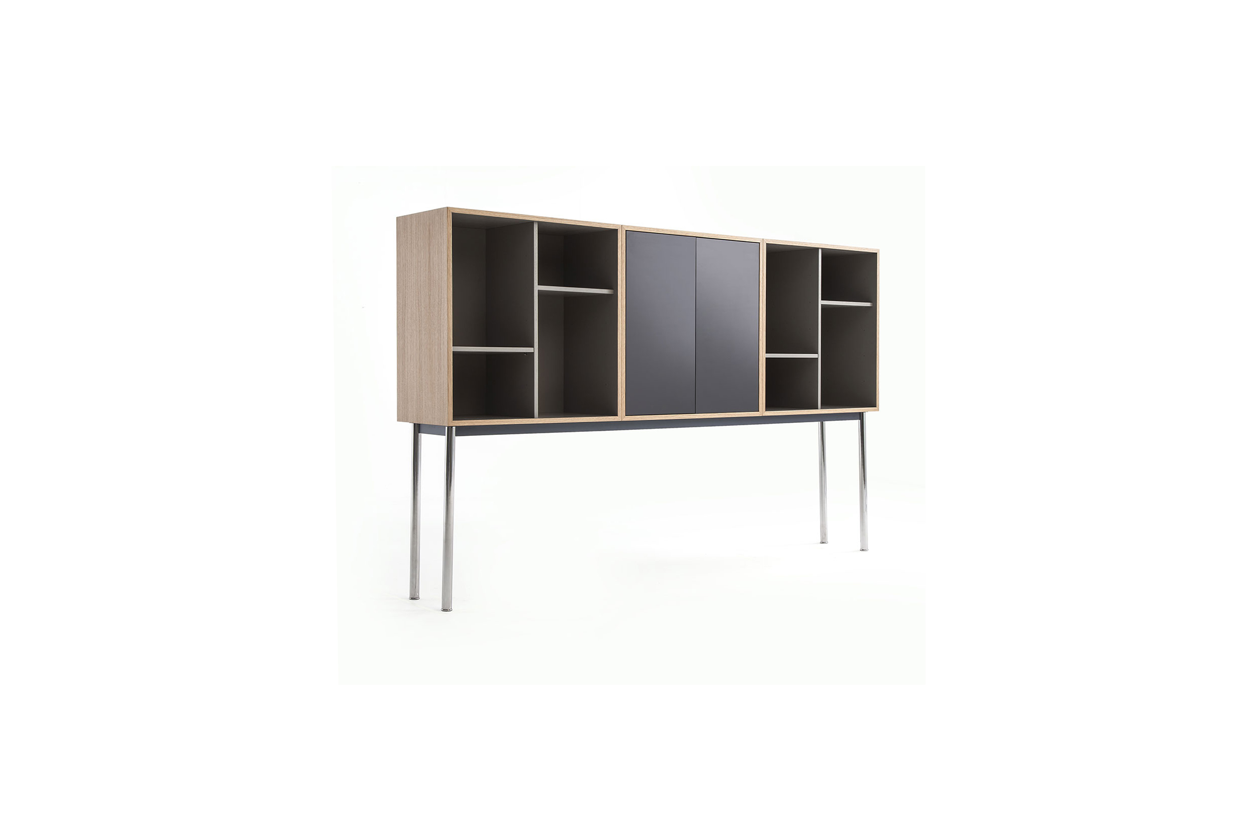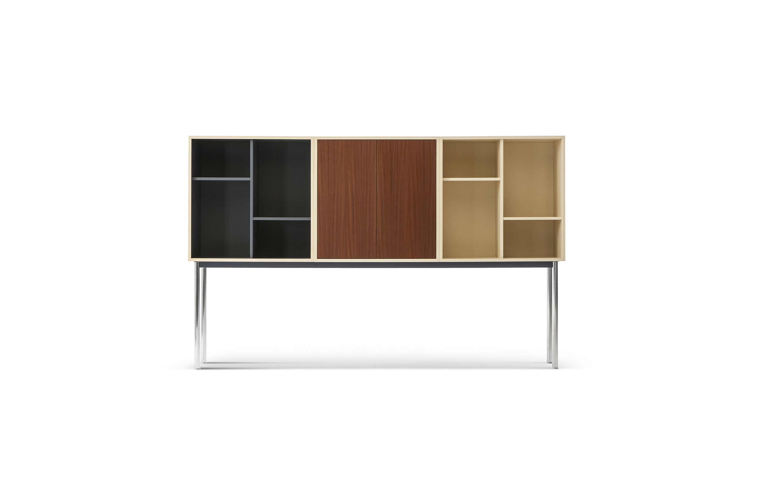 Charlotte Perriand在1984年设计的“标准柜”,由木质模块和可叠放的柜单元组成,用于满足各种要求(配备架子、抽屉等)。该款柜的基础元件是尺寸为75/75/37.5 cm的彩色中间方块。Le Corbusier和Pierre Jeanneret于1925年在巴黎“新精神展”展示了该款产品,这些柜子的设计直接源于办公室家具,除了能堆叠并连接在一起外,这款柜子还允许自由地安排空间。这款柜子由细长的底座支撑,从概念上来讲,可以比得上建筑物的容量。“标准柜”参展1929年的巴黎秋季艺术沙龙时有所改进,整体尺寸扩大,更接近真实的墙柜。