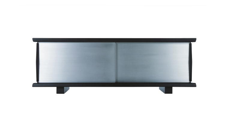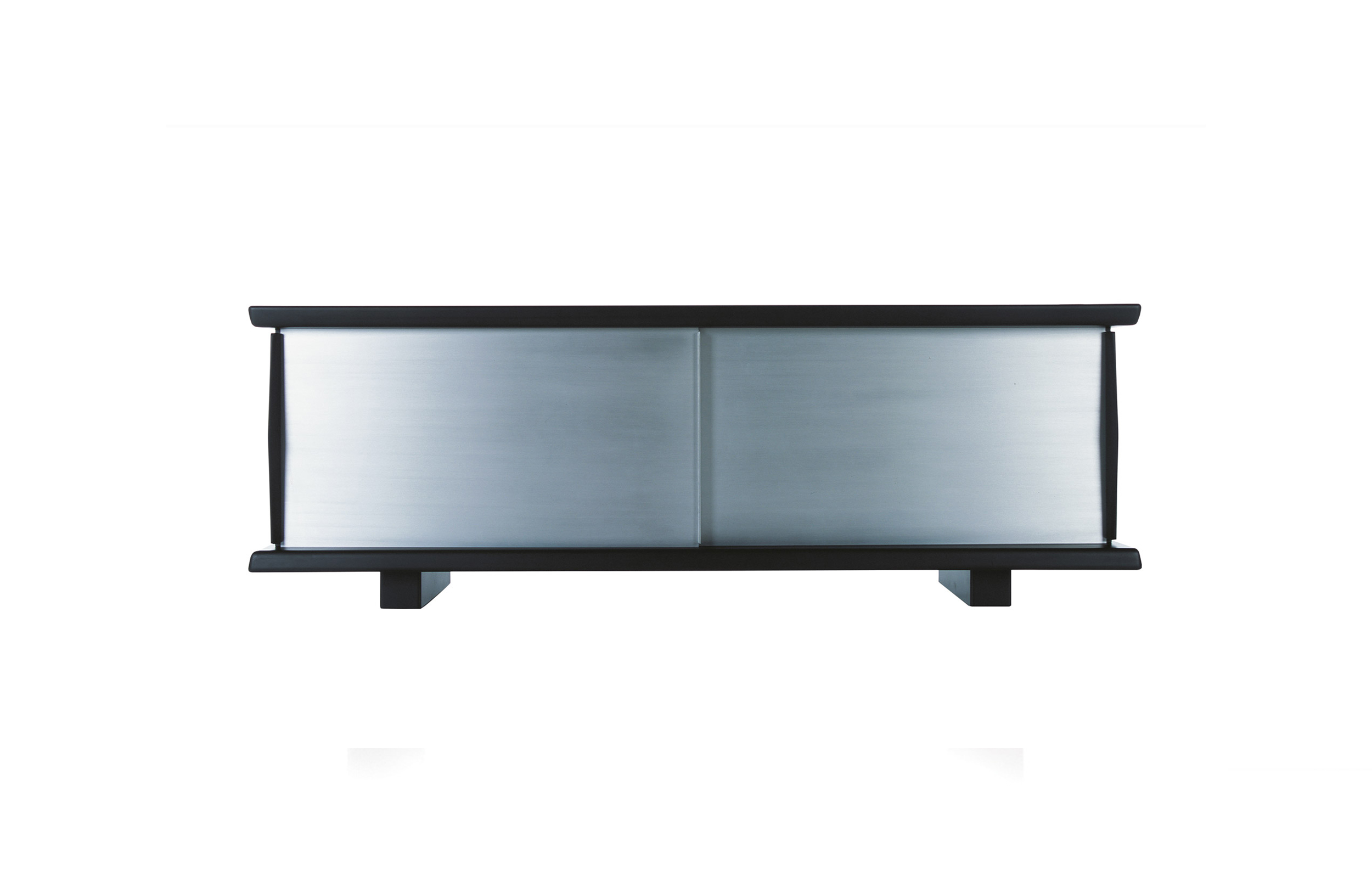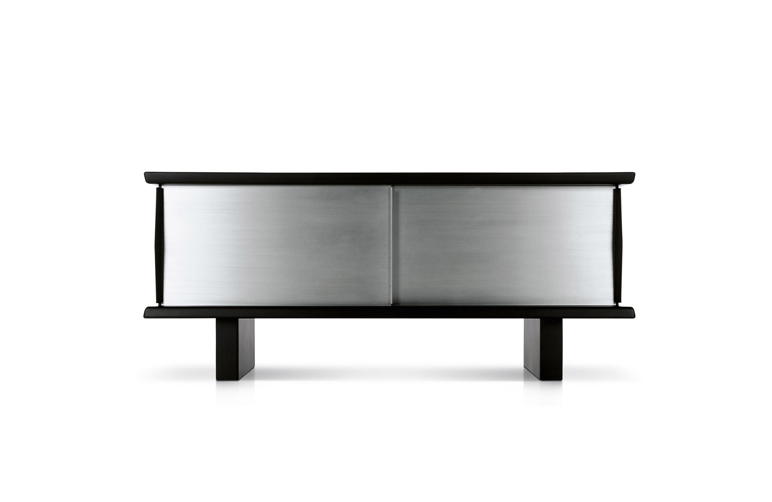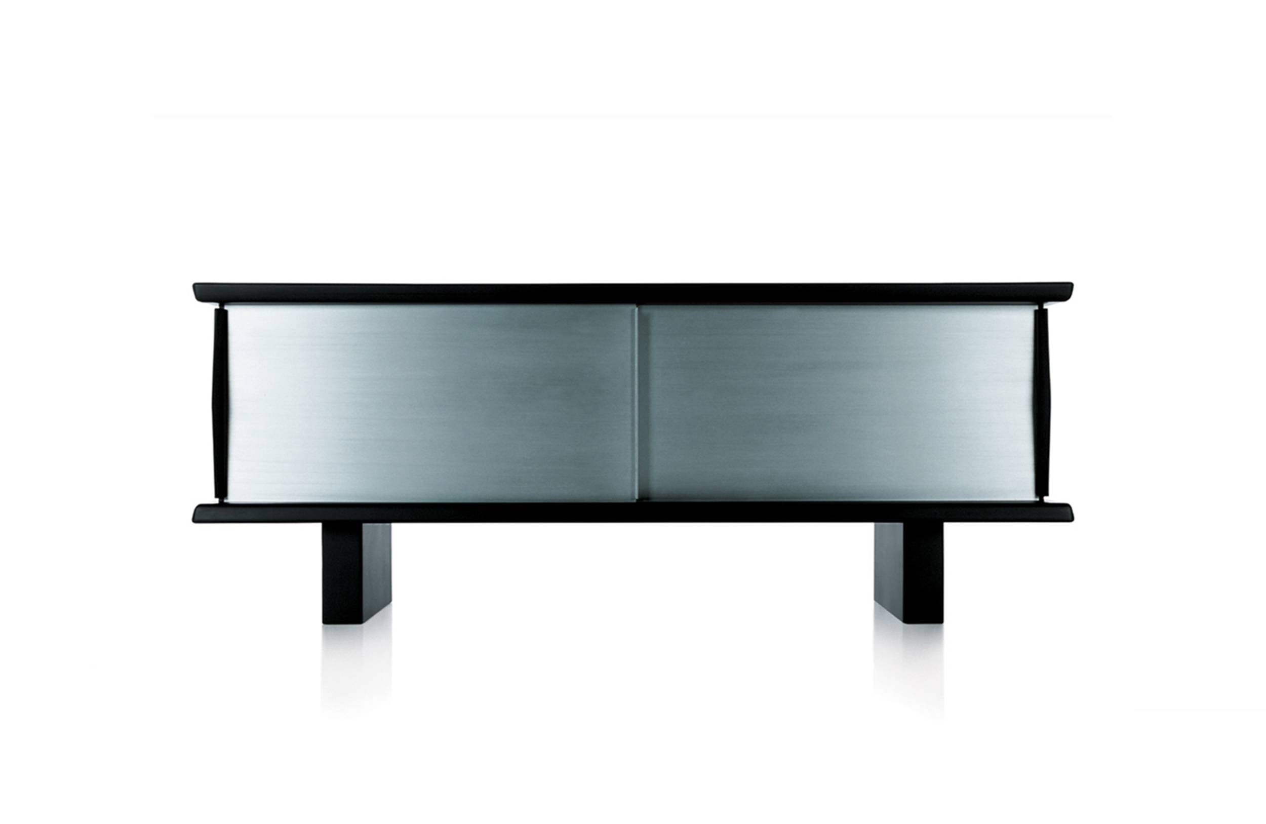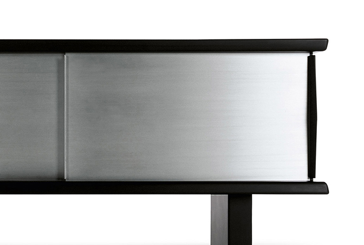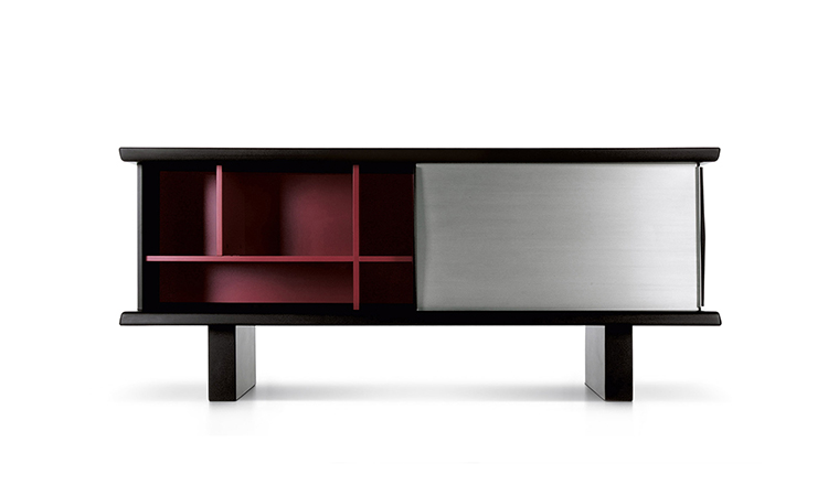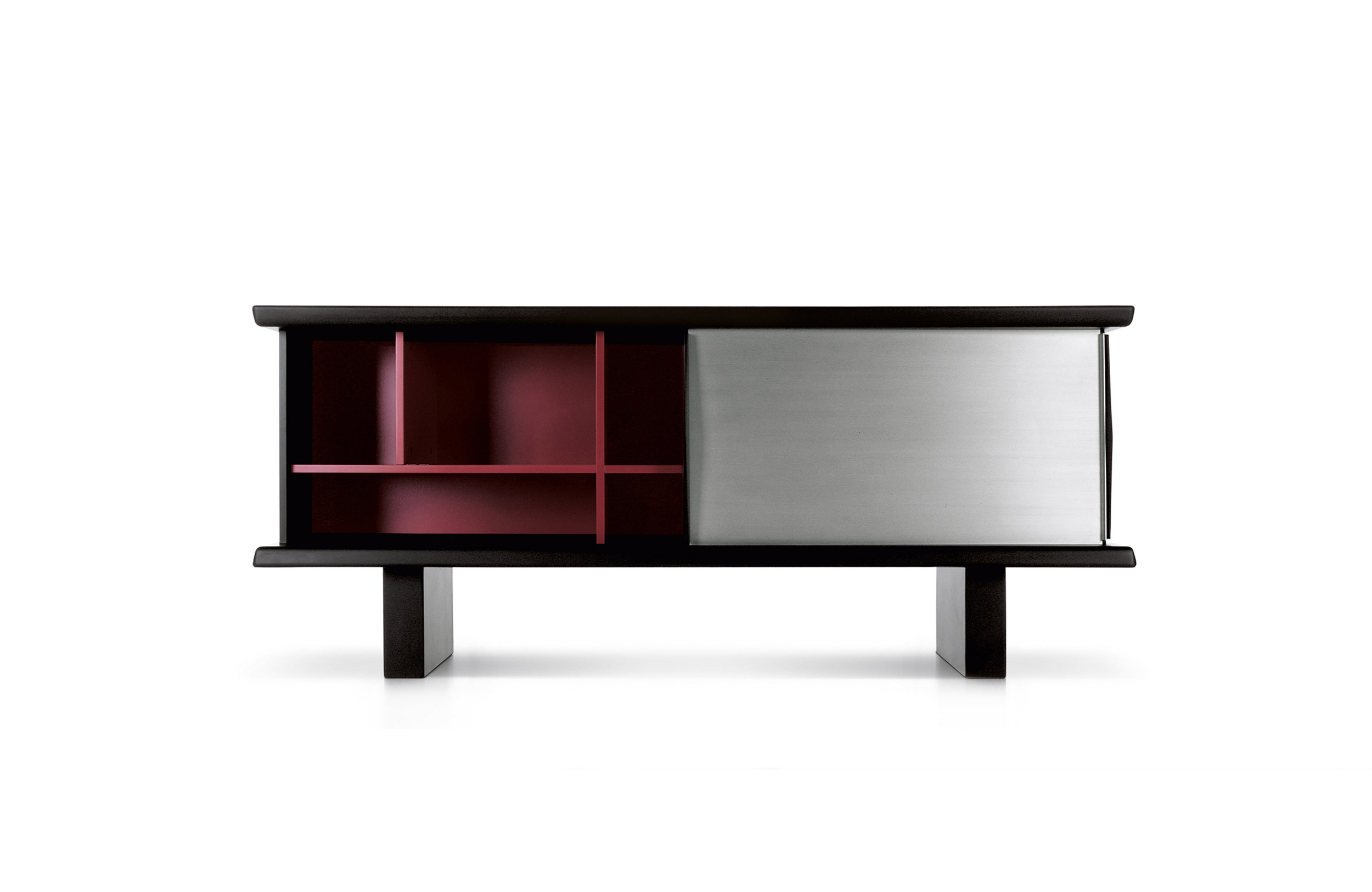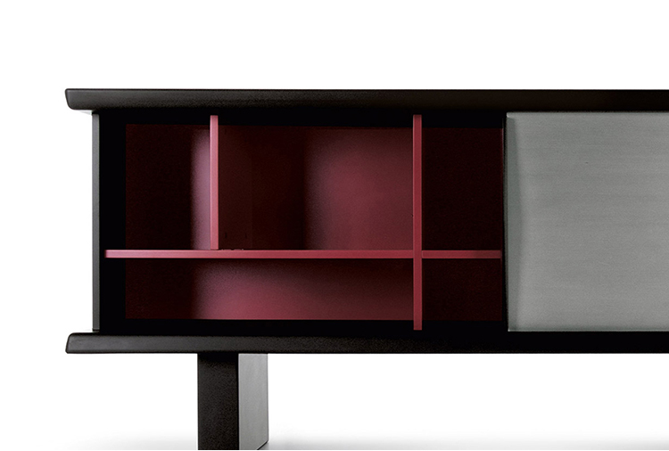 黑色漆光木制储物柜,浮雕外饰和枣红色内饰。抛光铝清漆滑动门。抛光铝清漆内架。该储物柜可使用金属架固定于墙面或配备高/低支脚独立摆放。