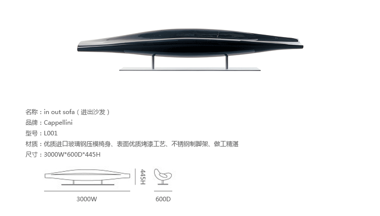 In Out Sofa(进出沙发) ,法国设计大师Jean-Marie Massaud极富时尚和想象力的作品,其线条简洁流畅,时尚大方,做工精湛。沙发和板凳提供两种版本︰座椅玻璃纤维颜色有黄色、橙色、红色、绿色、蓝色、白色、黑色、灰色或无烟煤,聚氨酯填充的座位,织物或皮革的集合扪面。采用了优质进口玻璃钢压模椅身、表面优质烤漆工艺、不锈钢制脚架。