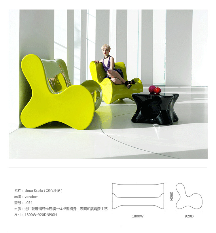 Karim Rashid,当代最耀眼, 最多杰出作品的美国设计师,为西班牙VONDOM品牌设计了50个方案的作品,最终,它们归在6个系列。在这6个系列中,最突出的是DOUX系列, 一个器官造形的,友善的,色彩奔纷的。。。手绘出来的自然形状让你想触摸它,坐在它上面,享受它。 多功能性和未来感是这个系列最突出的元素。DOUX的桌子是多功能的 - 当躺下时,它是一张桌子,在中间的位置有一个孔,可以储存东西;当站立时,它变成了一个优雅的花器或一个可以放香 槟或酒的冰桶。