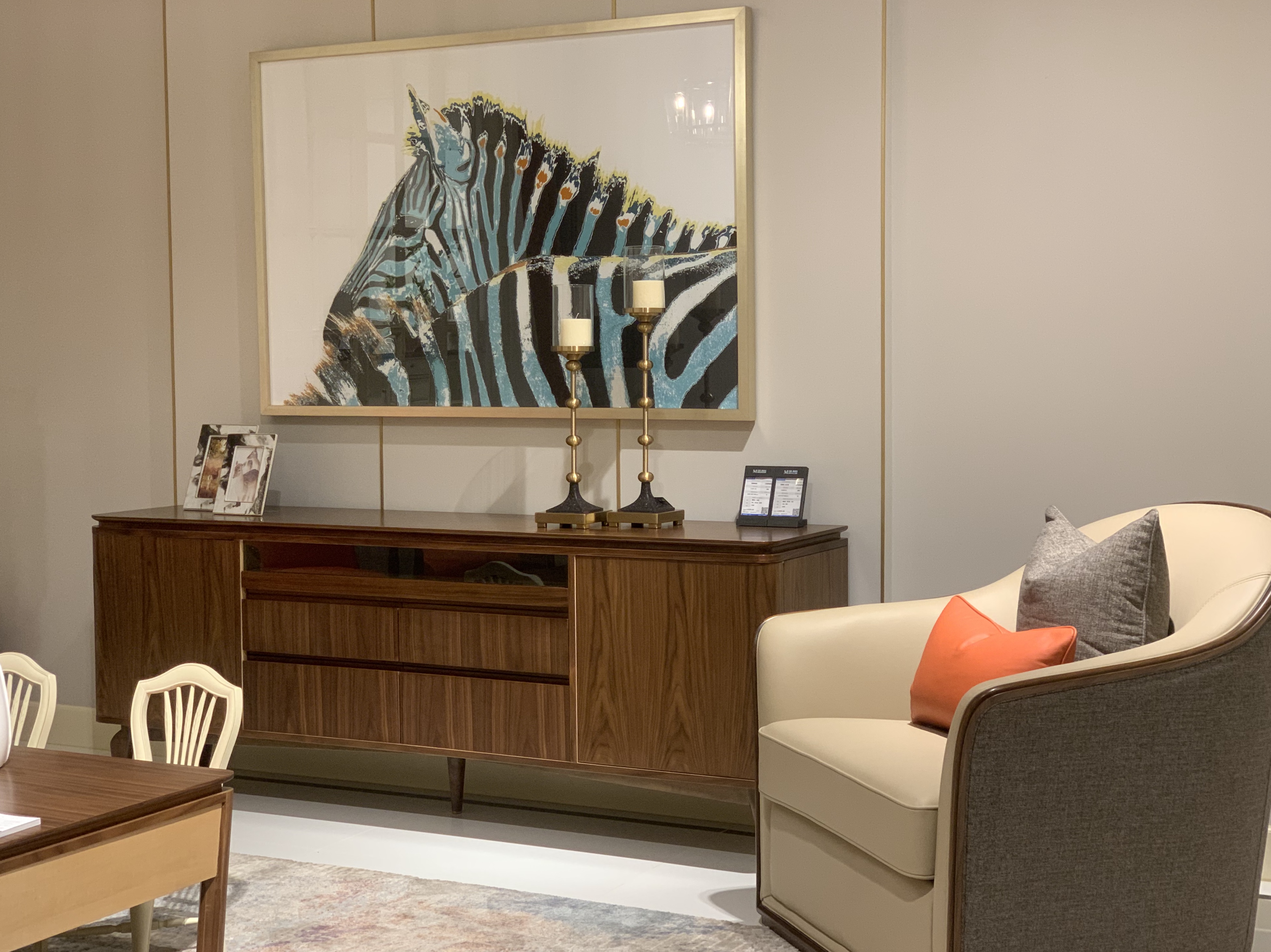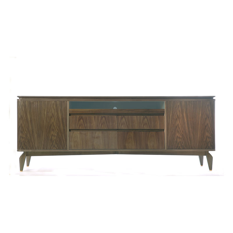 客厅电视柜造型现代优雅,设计灵感源于后现代主义风格。电视柜中间部分的第一个抽屉采用滑动托盘与烟色玻璃组成,提供了独特的使用功能,可以用于放置电视机顶盒设备和其他的配件。通过玻璃的使用,可以方便设备与遥控器的连接。除此之外,电视柜还有两个橱柜以及两个大抽屉,可提供更多的储存功能。下部整体框架采用深色胡桃木进行装饰,精致而不失细节之美。