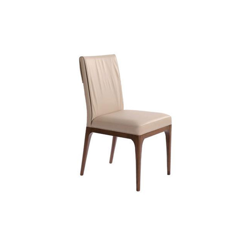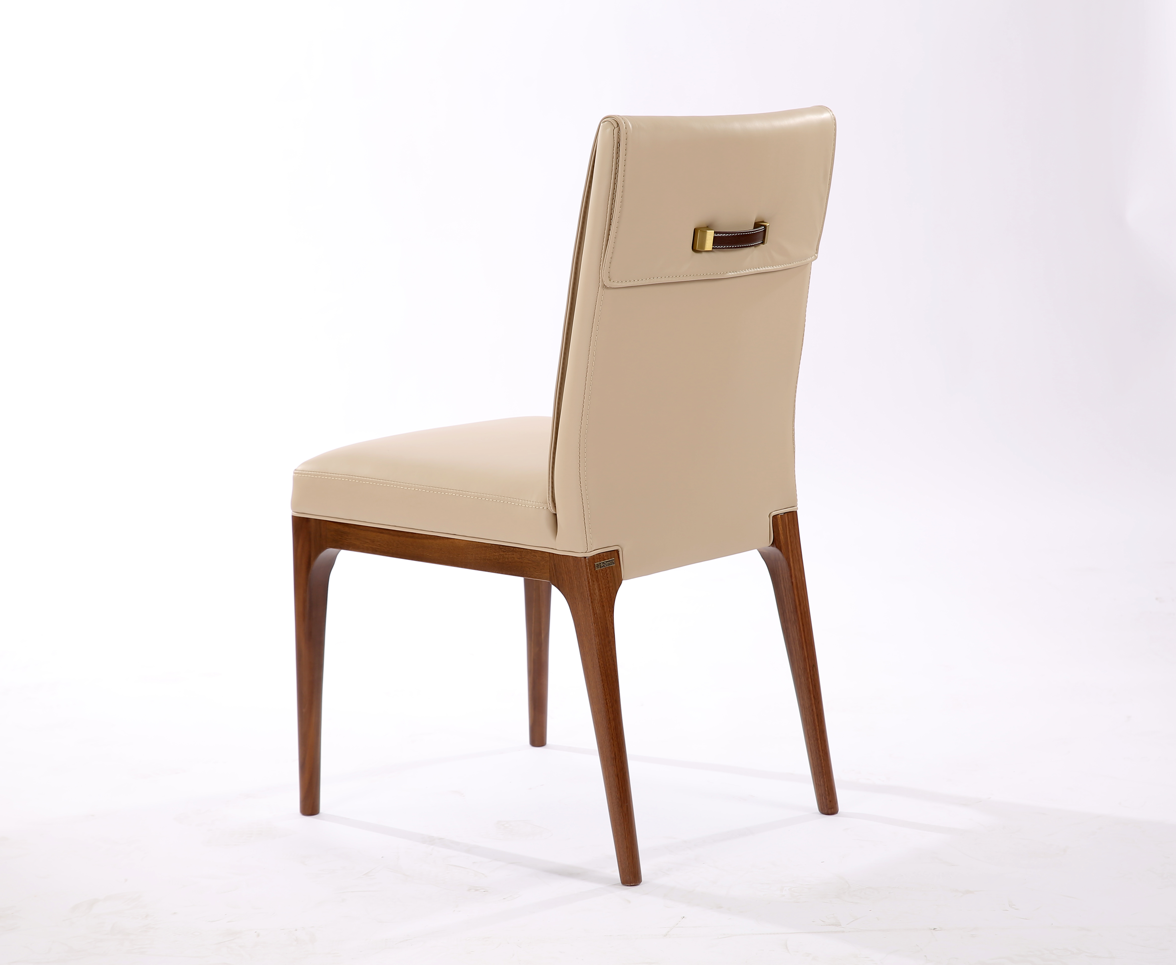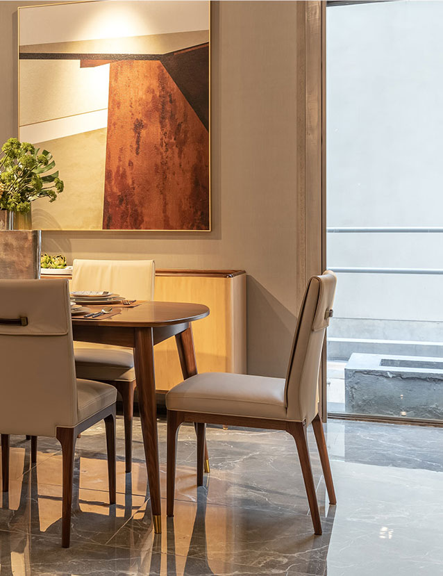 餐椅是餐厅独特的亮点,它营造了一种舒适的、高端的用餐氛围。椅子采用了相对较薄厚度的皮质座垫和靠背垫,优雅而时尚。椅子的背面单独设计成黄铜和皮革制的抓手,即有装饰作用又方便搬移。