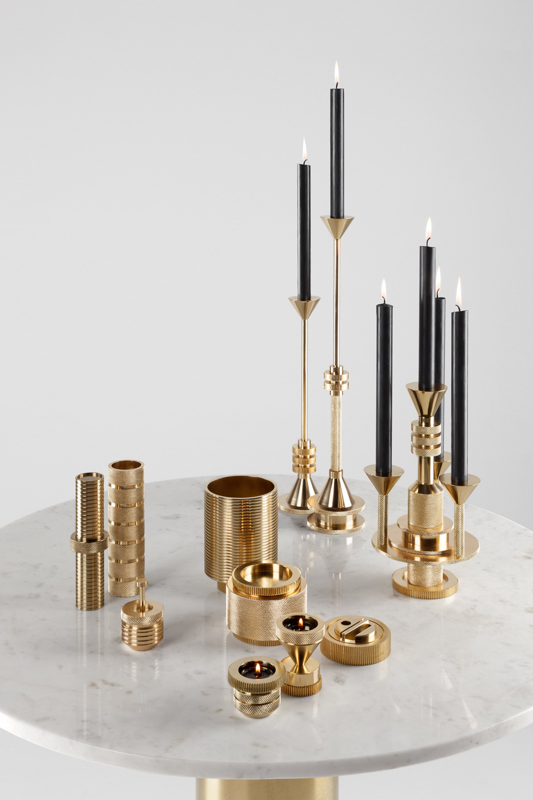 齿轮烛台可分为锥形或圆柱形。他们被设计用于各种配置和称赞在系列中的其他部分-整洁的办公桌,蜡烛烛台和烛台。