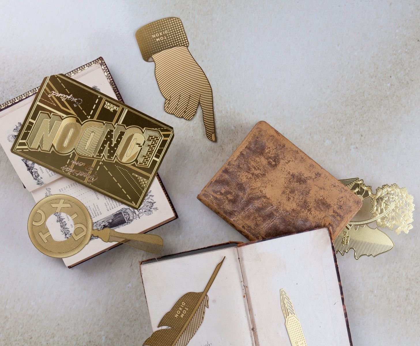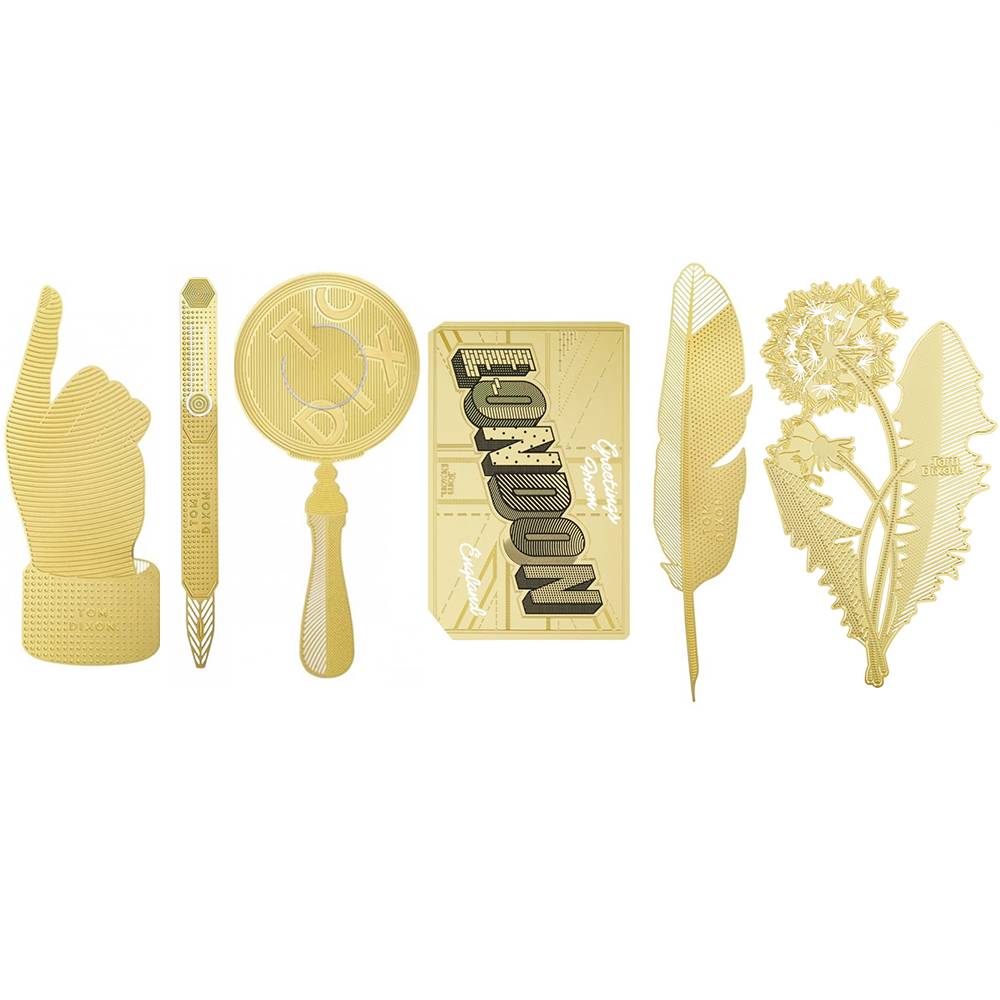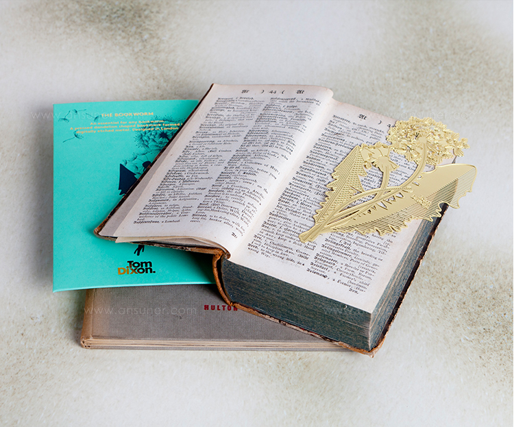 一个灵感来自大自然的书签和长期被遗忘的压花,往往落在一本备受喜爱的书的页面上。 工具蒲公英采用微观细节制造,从黄铜板精密蚀刻,创造出这种精致的花朵。 还有羽毛笔,钢笔,手形指针,明信片和放大镜。