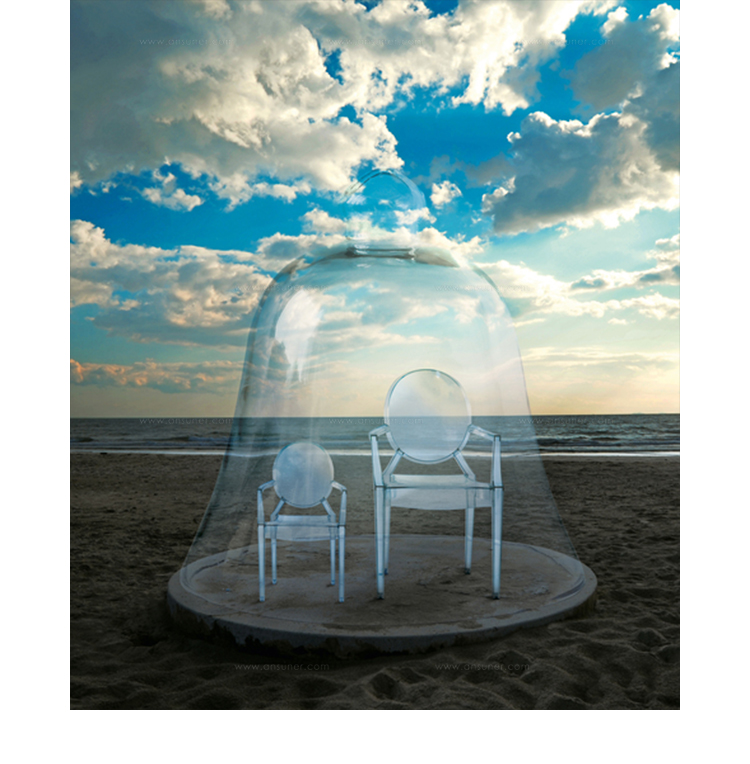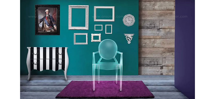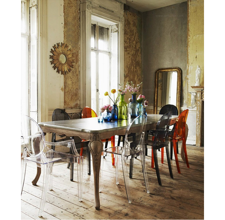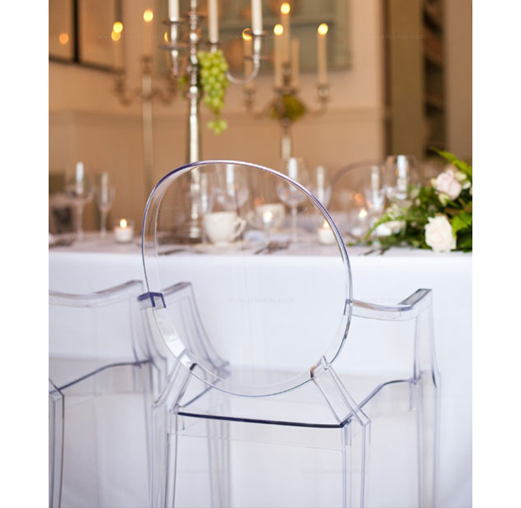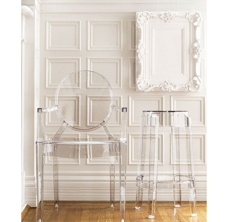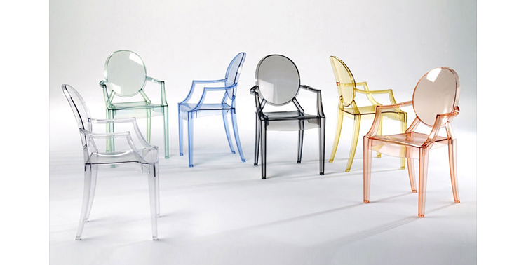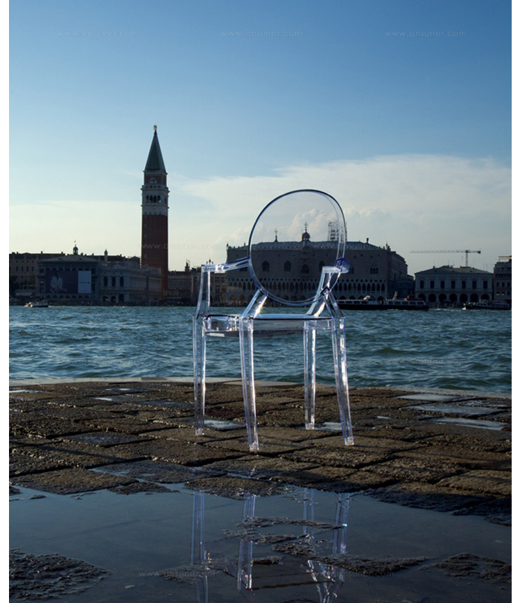 ouis Ghost 是以透明彩色的聚碳酸酯為材質,並有路易十五時期的巴洛克式風格,堪稱世上最大膽的使用聚碳酸脂注入模型中之作。儘管外觀上看起來纖細且透明如水晶一般,但實際上 Louis Ghost 卻是穩固且耐用的,經得起搬動、刮傷及天候的轉變,在收藏上,Louis Ghost 可以堆疊到六個之多。無論放在任何風格的住家或公共空間,Louis Ghost 皆能吸引眾人的目光並帶點優雅與反諷。