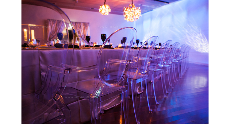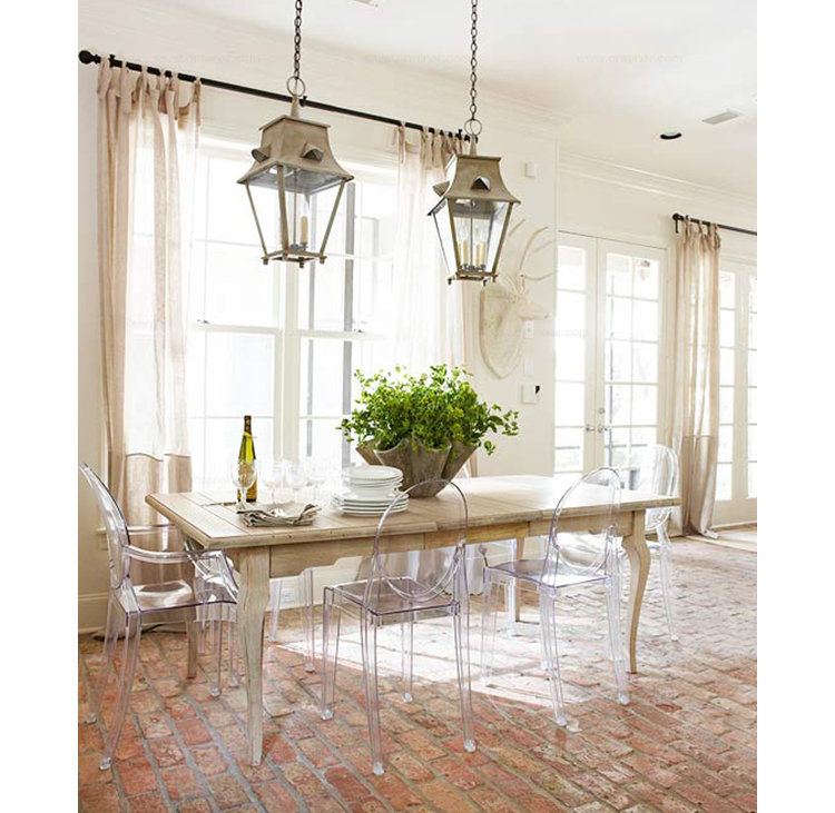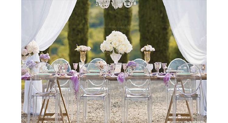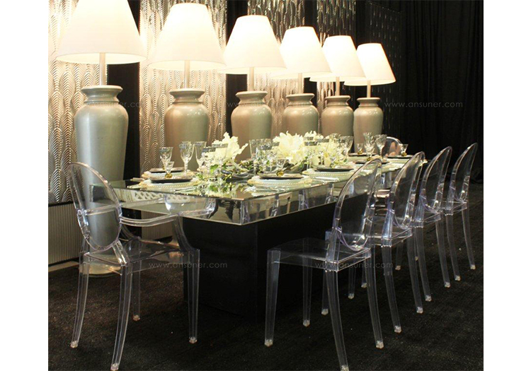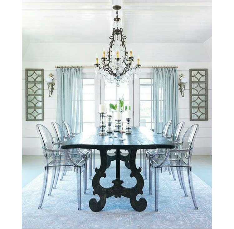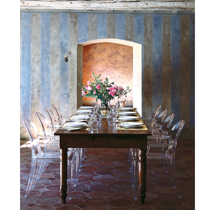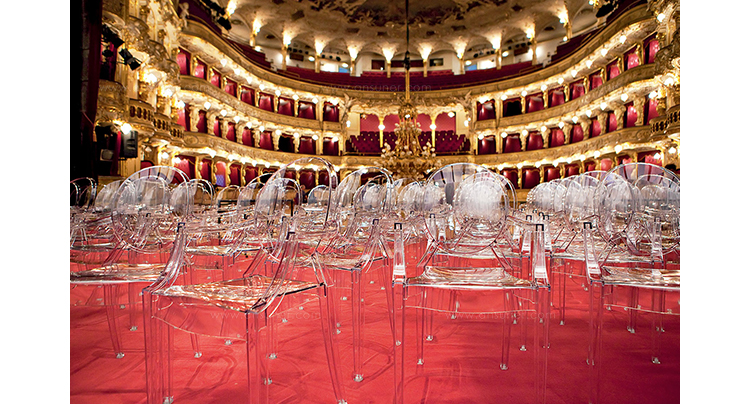 ouis Ghost 是以透明彩色的聚碳酸酯為材質,並有路易十五時期的巴洛克式風格,堪稱世上最大膽的使用聚碳酸脂注入模型中之作。儘管外觀上看起來纖細且透明如水晶一般,但實際上 Louis Ghost 卻是穩固且耐用的,經得起搬動、刮傷及天候的轉變,在收藏上,Louis Ghost 可以堆疊到六個之多。無論放在任何風格的住家或公共空間,Louis Ghost 皆能吸引眾人的目光並帶點優雅與反諷。