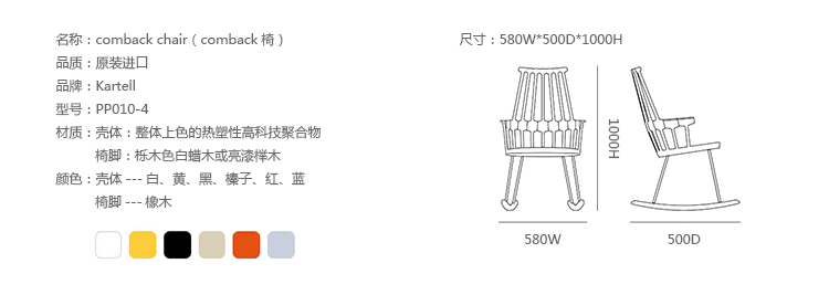 温莎风格椅被冠以乡村风格,但并非一成不变,在不同时期不同阶段又融入新的设计元素。Kartell的这款产品再一次享受重现经典的设计快乐,国际知名家居设计师Patricia Urquiola为温莎椅(Windsor Chair)打造了一个这款新的造型。回归十八世纪英格兰的辉煌时期“梳背”椅的特点,整个框架用亚光材质,靠背的7个分支结构朝着椅腰部位向下延伸,在一个加固六角形圆圈处与纤细的轴汇合,与椅座合为一体。聚碳酸酯材质的使用赋予COMBACK一种轻盈的质感和当代风格。浸透在黑色COMBACK梳背椅里的那一分淡定从容,能让人气定神闲,默默却又不留情面地将浮华虚荣隔在门外。因为不存在彩色光谱里,白色可以说并非真正色彩。纯白色Comback Chair梳背椅,唯美得让人难以抗拒。那种与世无争的清雅,好似刚刚落入凡尘的花瓣,昭示宁静与自然。这款Comback Chair 来自意大利的创新品牌Kartell,以发梳为灵感,回归18世纪英式风格,整齐对称的典雅扮相,表现出一份沉稳内敛的韵韵意涵。木质椅角的运用,让复古气息升华其中。配搭塑料椅身的现代风格特色,不愧为一份跨越历史的新时代作品。荣获2011年Wallpaper设计奖殊荣。