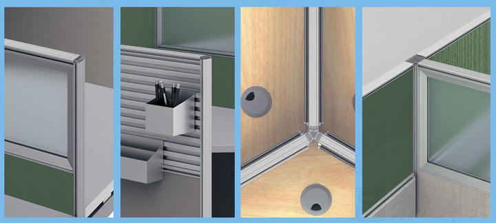 工作站中加装较高的桌上屏风,来创造工作团队中也有属于自己的区域。用高屏风来区隔本工作团队和别人。