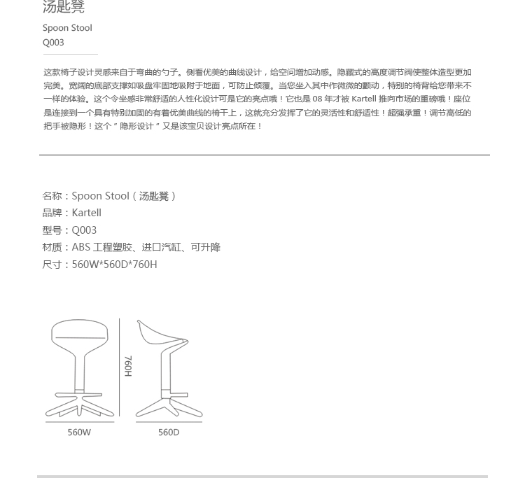 这个令坐感非常舒适的人性化设计可是它的亮点哦!它也是08年才被Kartell推向市场的重磅哦!座位是连接到一个具有特别加固的有着优美曲线的椅干上,这就充分发挥了它的灵活性和舒适性!超强承重!调节高低的把手被隐形!这个“隐形设计”又是该宝贝设计亮点所在!