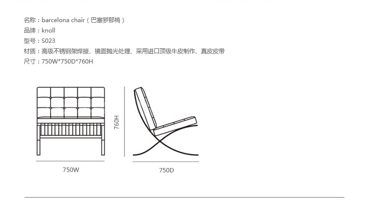 巴塞罗那椅由设计师密斯在1929年巴塞罗那世界博览会上,为了欢迎西班牙国王和王后而设计,同著名的德国馆相协调。这件体量超大的椅子也明确显示出高贵而庄重的身份。当年的世博会德国馆是密斯的代表作,但由于建筑的设计意念独特,竟没有合适的家具与其搭衬,所以他不得不专门设计了巴塞罗那椅来迎接国王和王后