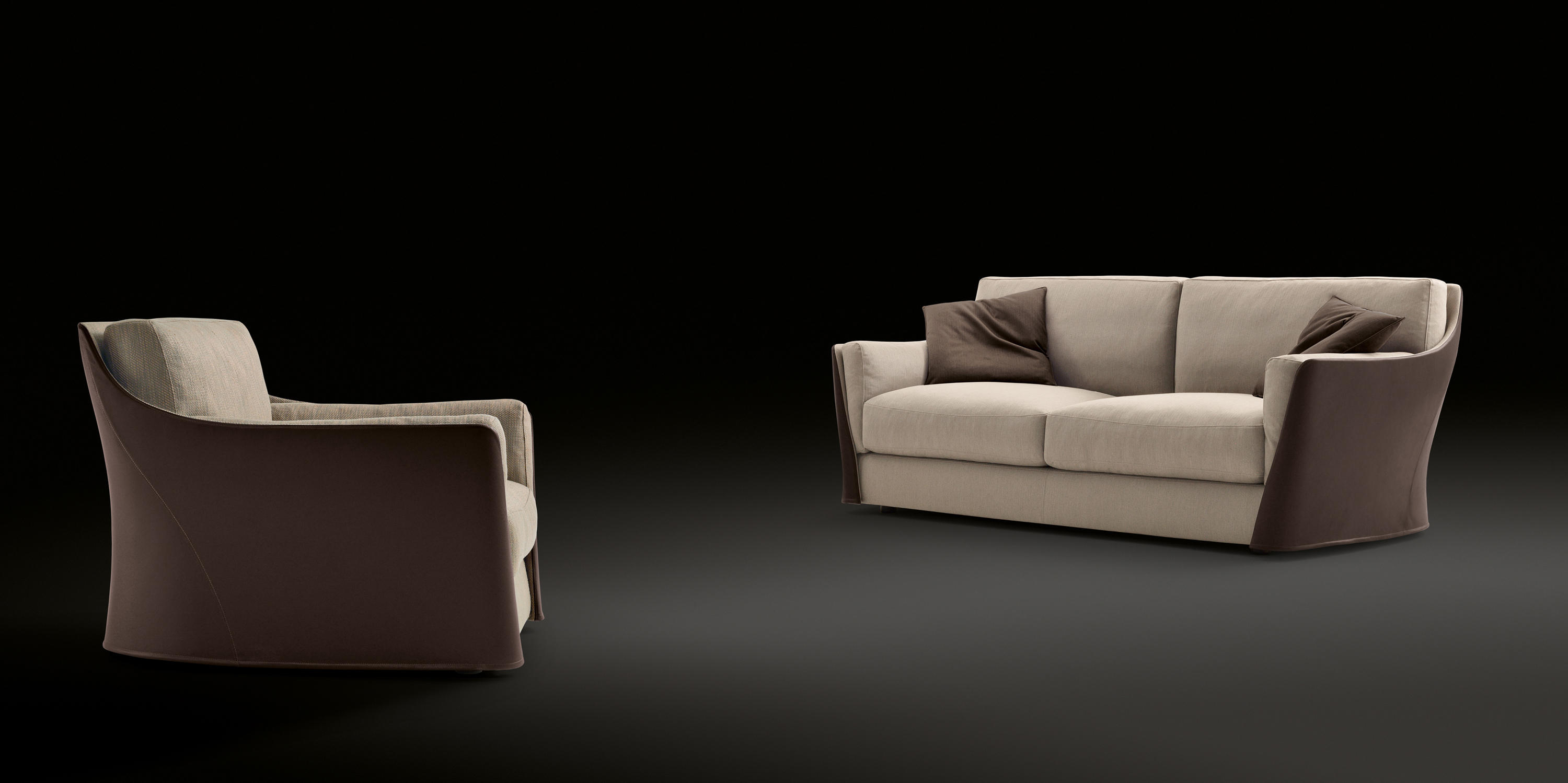 扶手椅和沙发的结构型钢的靠背,座位上的一个杨树胶合板和coldfoamed填充聚氨酯纤维覆盖。 靠背和坐垫上的鹅羽毛,最后在扩大聚氨酯的插入。 家具,完全可移动的织物或皮革,可以是一种颜色或两种颜色在皮革和内部外部织物或皮革。 一个在鹅的羽毛垫扶手椅和两个沙发的推荐.