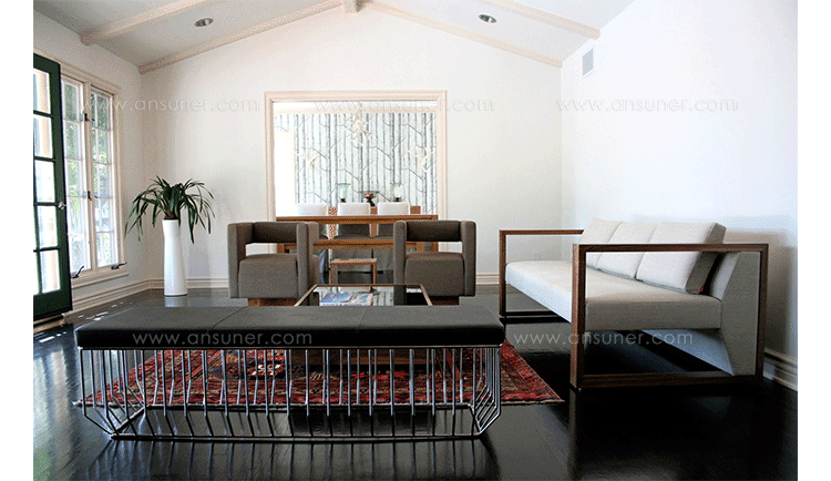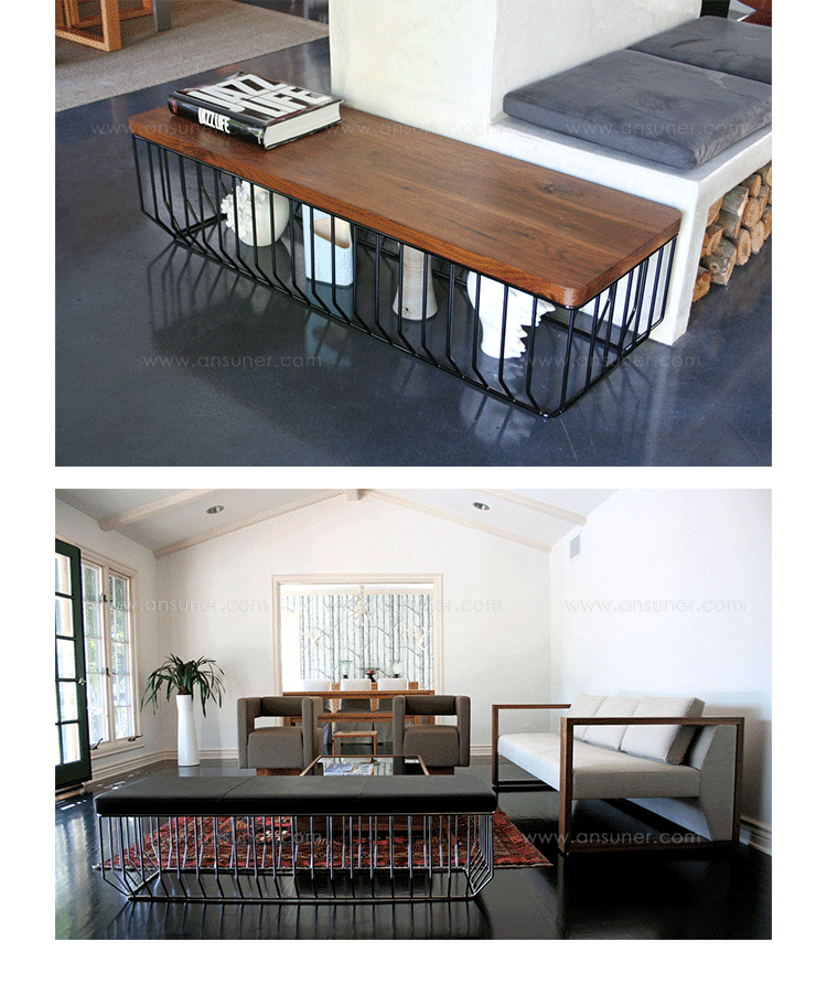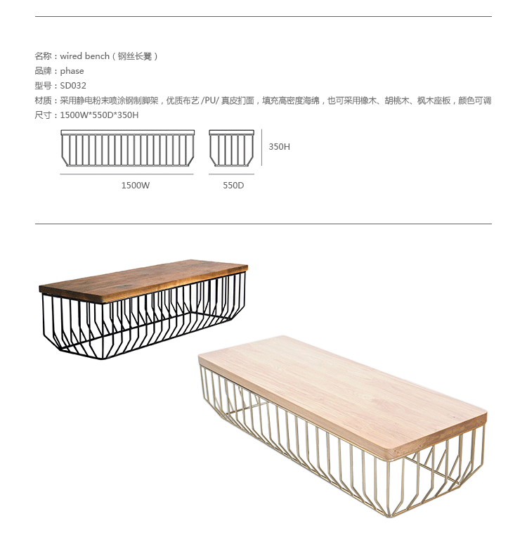 "Blending sloping angles and taut lengths of bent metal are a modern interpretation of the wiry idea initially conceived by Warren Platner.The series is made up of a suite of tables,side tables and benches and fitted with luxurious solid wood or upholstered tops."