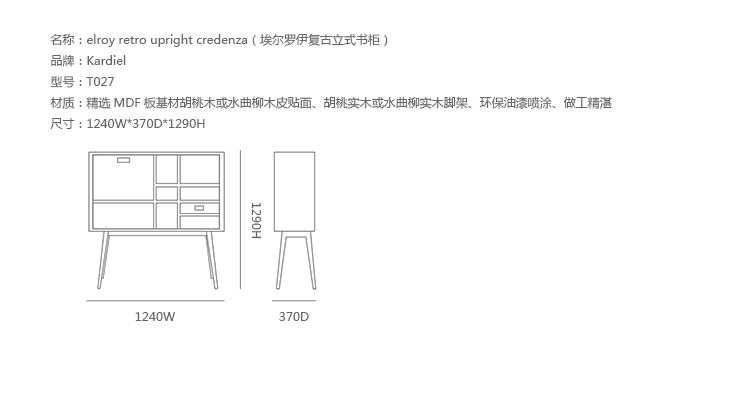 elroy retro upright credenza(埃尔罗伊复古立式书柜)是Kardiel公司制作的经典实木家具,1960年设计,是一件不朽的设。这个当代复古立式书柜有着高高的脚架,多个滑动抽柜和开放式抽屉。它允许“公开展示”和“隐蔽”所有类型的珍惜贵重物品的存储物。不锈钢装饰抽屉拉手和基部的尖尖的脚钉。