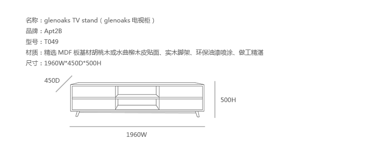 glenoaks TV stand(glenoaks电视柜),中世纪风格,复古别致,设计精美,长方形的设计非常适合摆放电视,此外平台下面还有4个抽屉和2个开发的空间,给您更多存储空间。制作采用精选MDF板基材胡桃木或水曲柳木皮贴面、实木脚架、环保油漆喷涂、做工精湛。