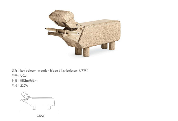 "出自丹麦设计大师 Kay Bojesen 的设计作品,精致的木制动物系列,是 Kay Bojesen 为人熟知的珍藏作品系列,采用不同的橡木、枫木、柚木等原木素材,保留木材的独特纹理,刻画出各种不同让人莞尔一笑的动物姿态,跳脱生活中的烦琐与紧张,简单的玩偶,轻松的神情,带您回归孩时的天真与简单快乐。