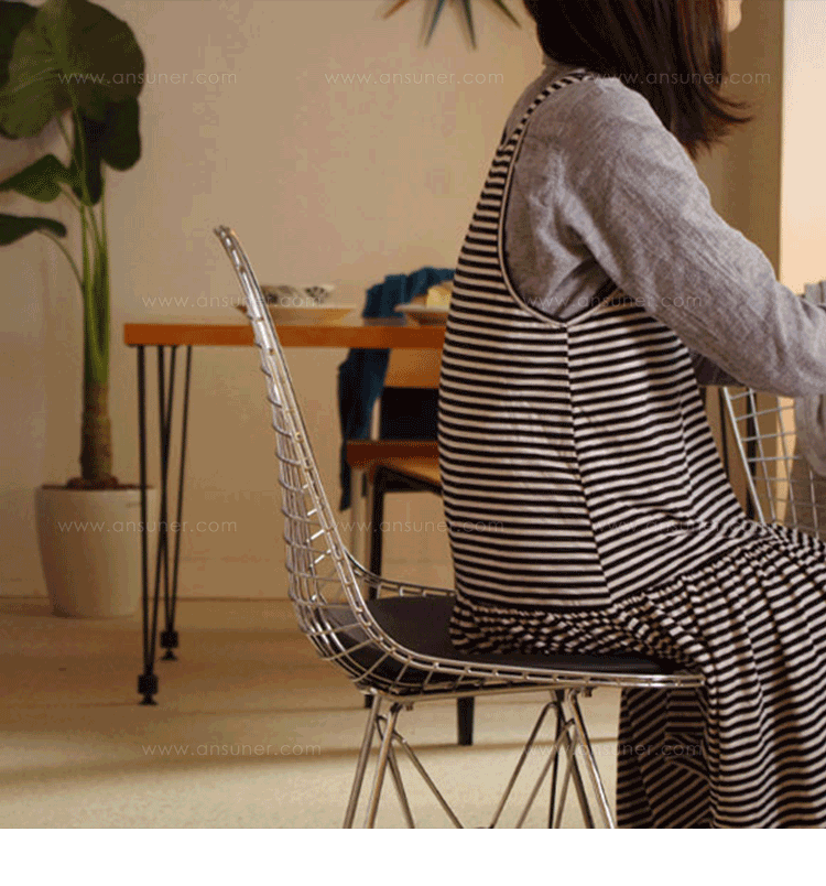 Charles & Ray Eames 1951 年發表的 Wire Chair 系列,以一片式有機網狀椅座,延伸變化出一系列不同椅腳及座墊搭配的單椅,這系列椅款輕巧透明的設計,在 60 年代可說是運用了當時最先進的技術來製作,靈感則是來自於鏤空的金屬收納籃,金屬條交織的椅座,彎曲的弧面不僅符合人體工學,在視覺上更具有穿透性。