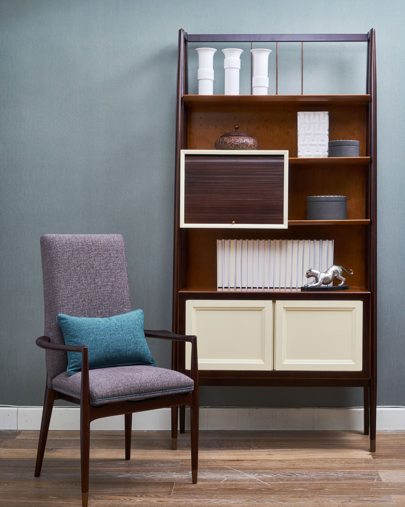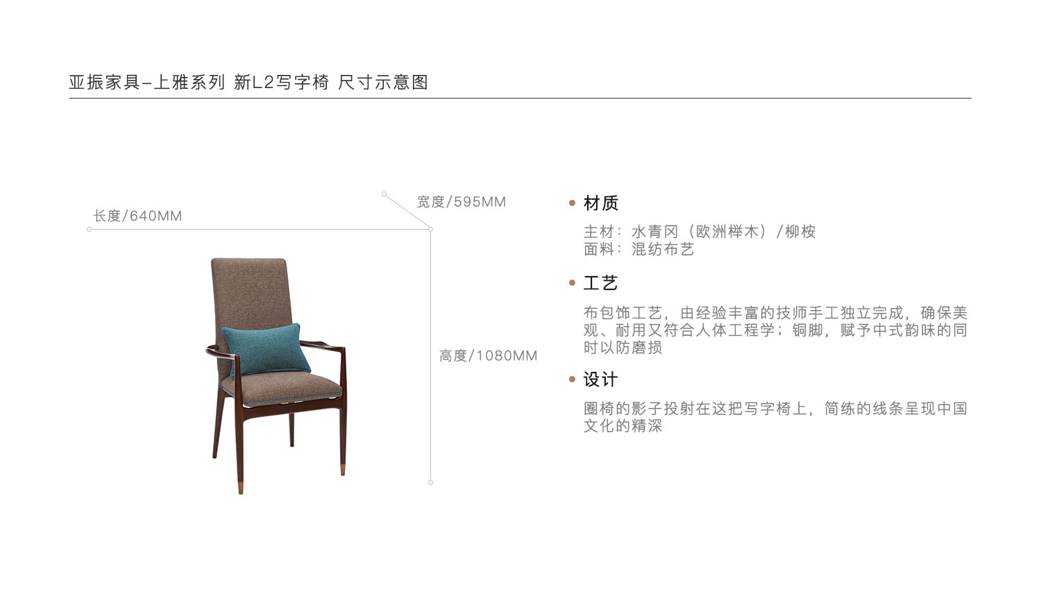 布包饰工艺,由经验丰富的技师手工独立完成,确保美观、耐用又符合人体工程学;铜脚,赋予中式韵味的同时以防磨损。圈椅的影子投射在这把写字椅上,简练的线条呈现中国文化的精深。