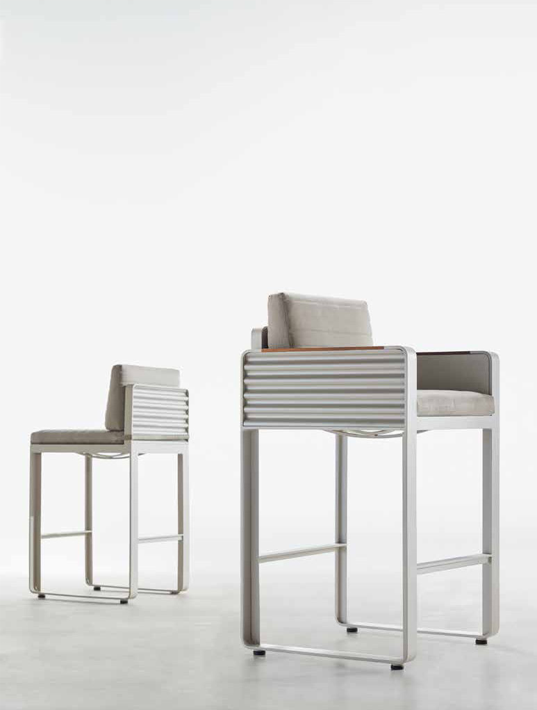 艾尔伯特系列由弯压而成的 T 型铝管和波纹金属板材精心打造而成。 其中波纹状金属板(CSM)曾被德国德绍容克斯飞机公司推选为制 作首批和最大的舰队商用飞机的最佳材料。 波纹状金属板(CSM-Corrugated sheet-metal)由钢铁或铝制成, 一般被广泛用于私人或者商业建筑物的墙体及屋顶。按照各种大小 比例排列成型的波纹可以持续使用,美感的外观经久不衰。 波纹状金属板(CSM)使用广泛并且低成本,生产程序简单但应用 是无限的,之后高端耐用的旅行箱的标准外观也采用了这种经典波 纹设计。 这也是为何设计师选择了艾尔伯特(Airport)予以命名。如图所示, 波纹氧化板巧妙地嵌进平面金属结构中。 按照建筑比例和元素,艾尔伯特(Airport)户外系列可以很好地融入 公共场所及使用于私人花园及露台。