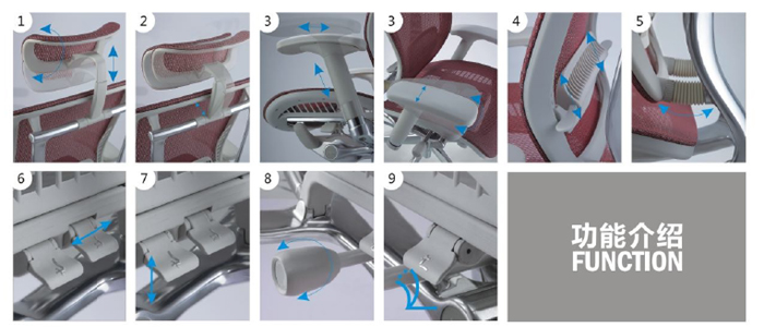 1、椅面: 此款全采用韩国进口网布,透气性强,弹力好,采用PU定型泡棉,长久使用不变形,且设计符合人体工学理念。2、扶手:PU扶手垫,内含升降机构,扶手可高度调节,前后调节,宽度调节和角度调节。