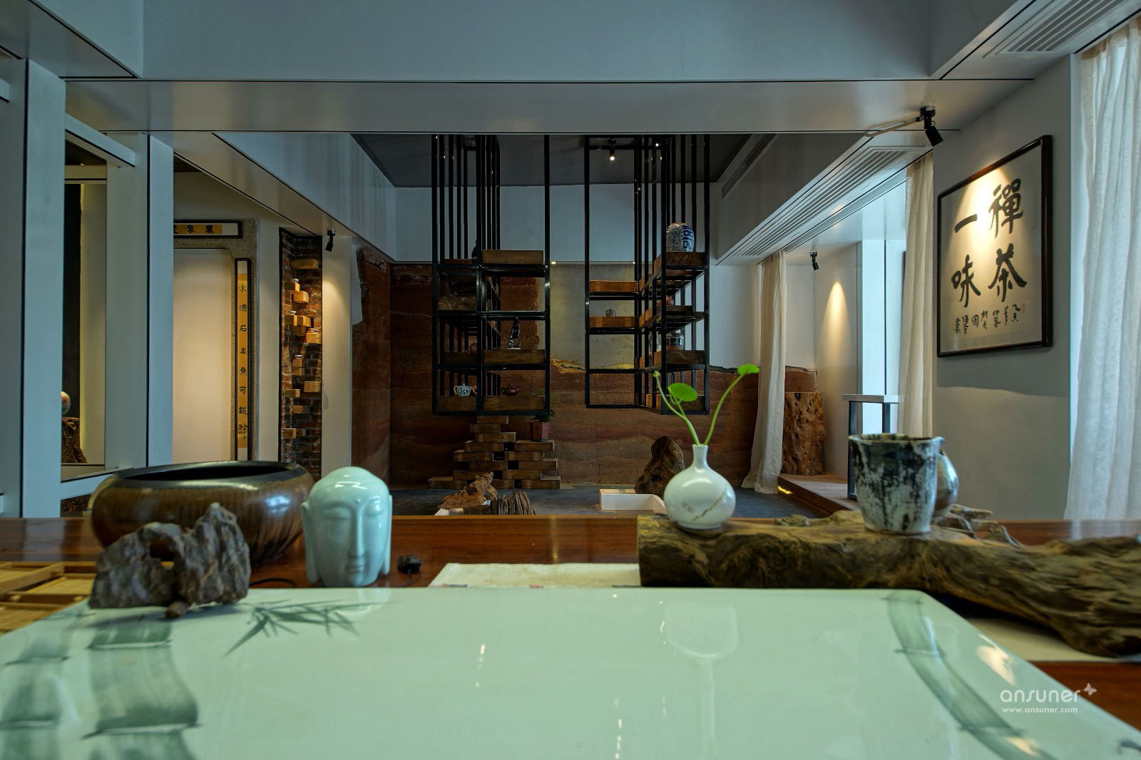 钢筋水泥的生活是城市的写照,泥巴、瓦片、木头是桃园生活的表象。在都市营造诗意的栖居,让内心宁静、自然,是本案设计的初衷。