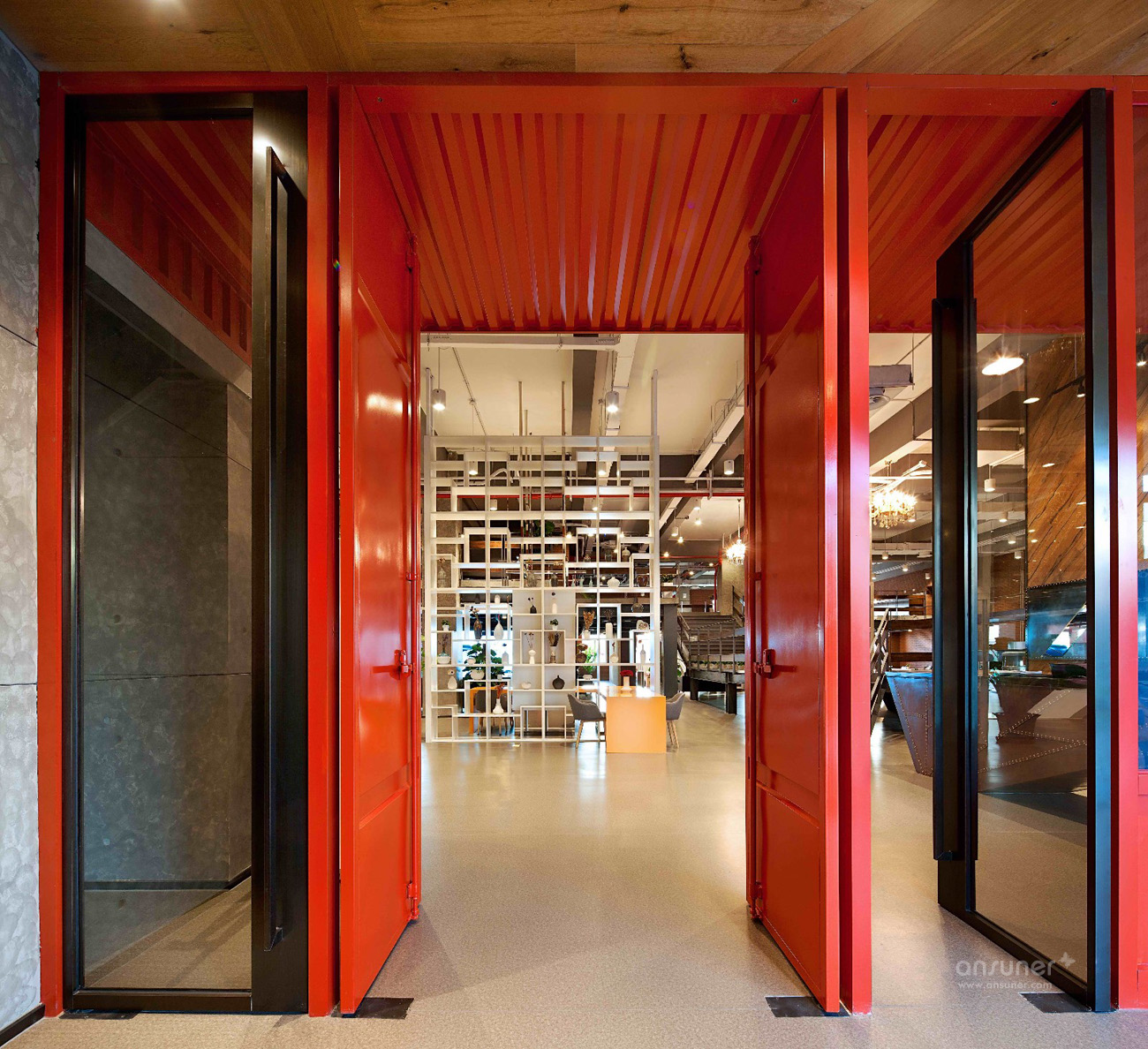 入口处醒目的大红色门厅,墙壁饰面采用集装箱纹理,与接待台后的木色饰面即形成了鲜明对比,同时又烘托出了温暖、开放的环境氛围,独特的工业风格特色让人第一眼就留下深刻印象。铁制的接待台经过特殊锈化处理,展现出了斑驳仿旧的视觉效果。