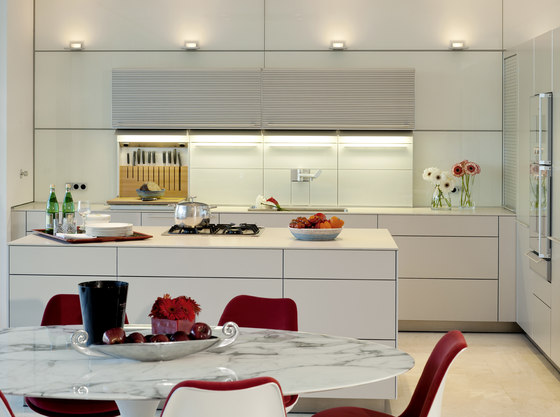All the additional functions of the pavilion are contained in a central lacquered wood block, which acts as a sort of a thick penetrable wall that separates the kitchen from the living room without dividing the space with doors, and in which are located the powder room, the kitchen, the stairs, bookcases, all mechanical systems and the technological and audio-video equipment.