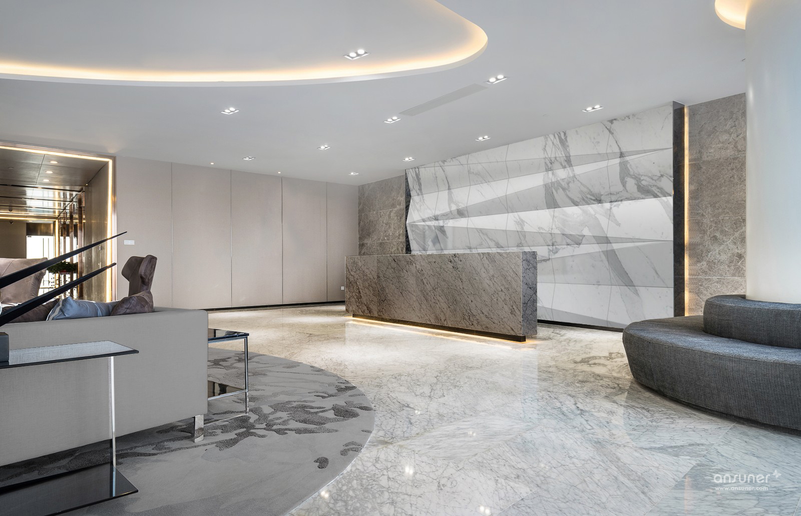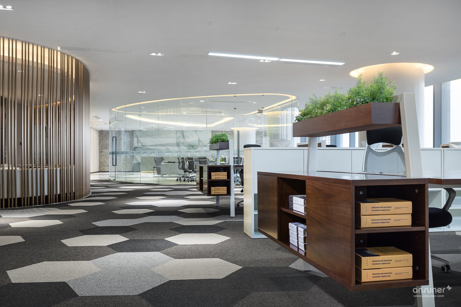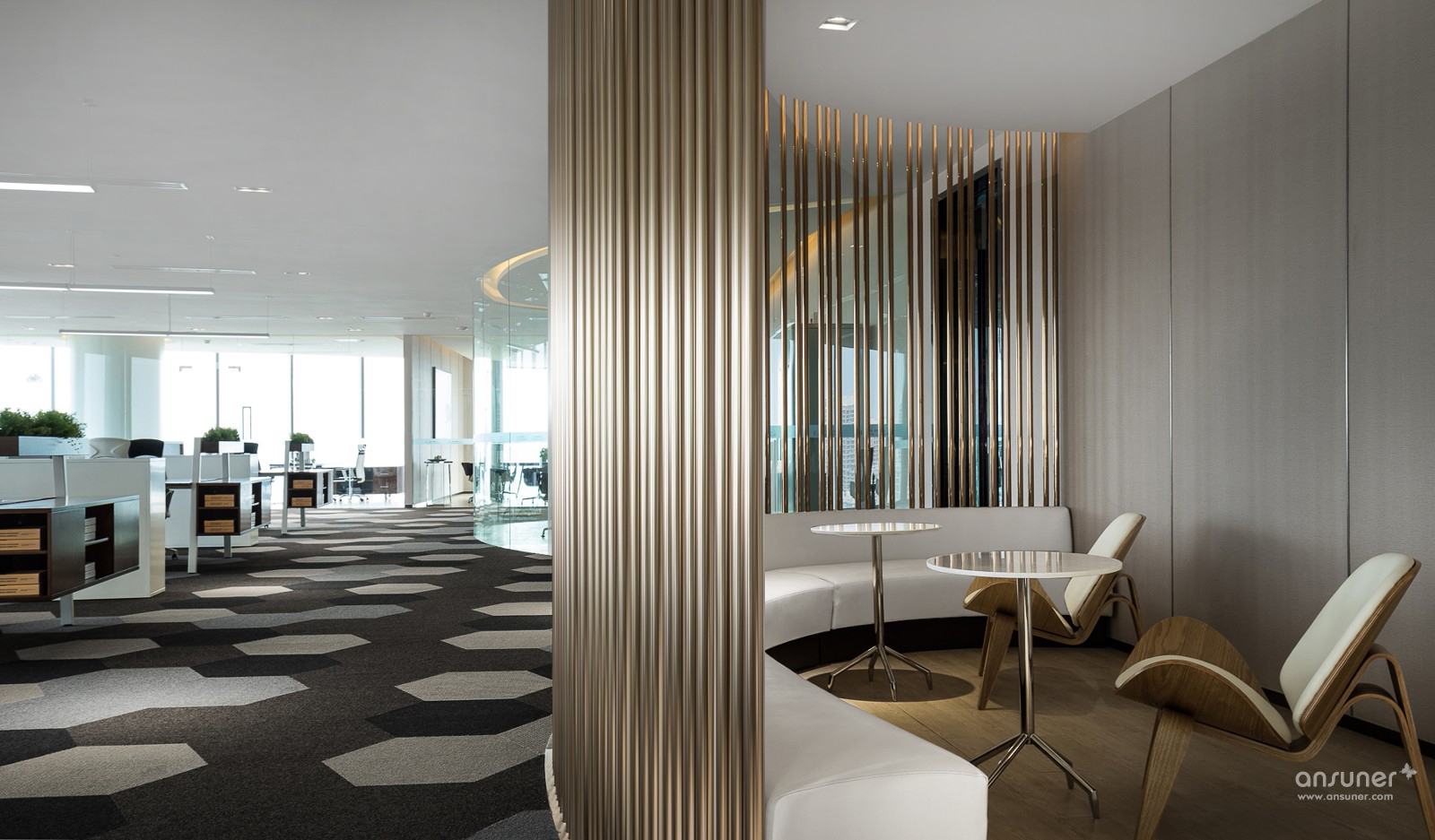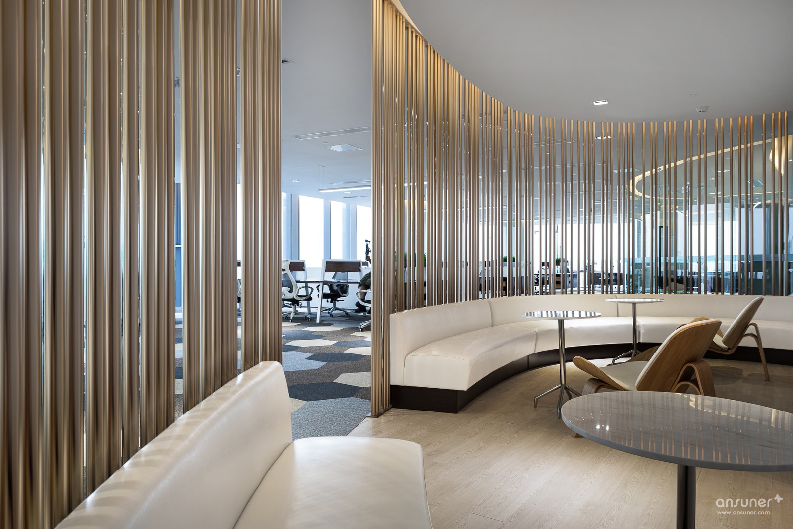 接待大堂背景墙使用了鱼肚白石,通过简单的折面处理,突显石材的天然纹理以外亦更显立体感。天花沿用了圆弧线条,形状与相邻的会议室形成对称关系,使空间更为流畅连贯。进入办公区,地面采用灰色渐变的六边形图案地毯,配以原木色办公家具,增添了几分活力,令人更有归属感。办公区右侧为茶水间,仅以哑金色圆管疏密有致地作为阻隔,两者既互通却不相互干扰。