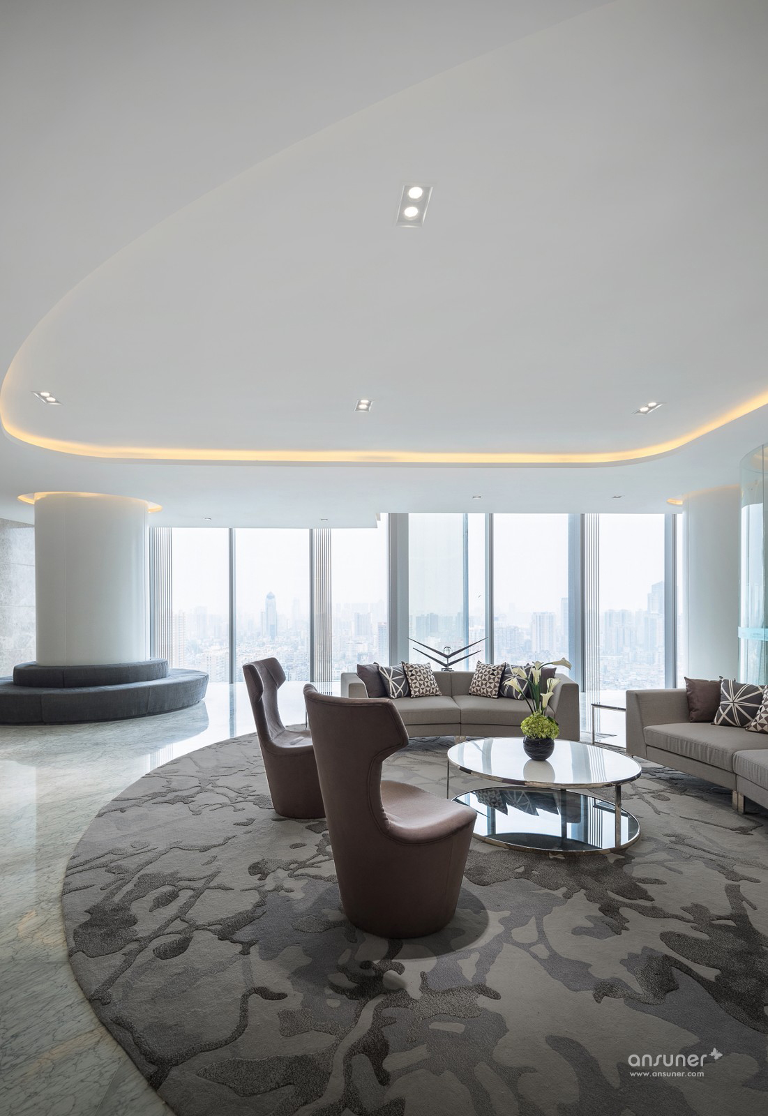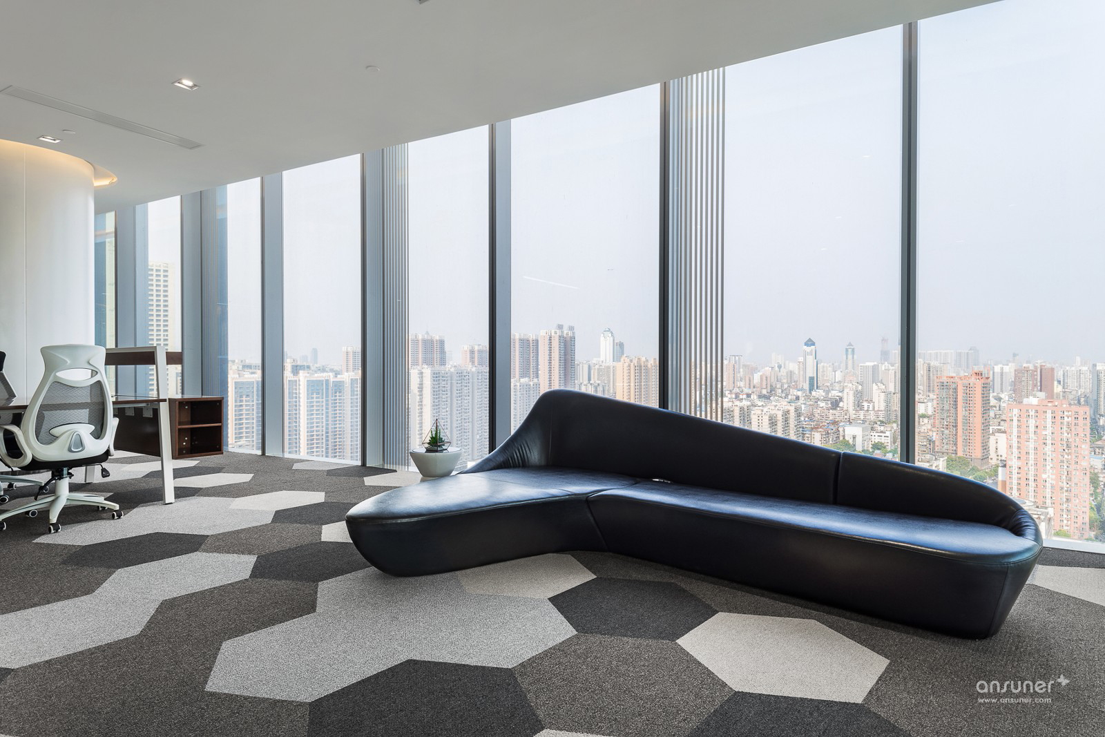 武汉越秀财富中心为华中地区位居第三的高楼,总高330米,地处武汉汉口核心地段,内环线西顶点,承武广,临汉江,居百年大道一中山大道之源。项目位于22楼的办公示 范间,为营造一个既开放又相对独立的办公空间,设计以黑、白、灰为主色调,空间以圆弧玻璃划分。