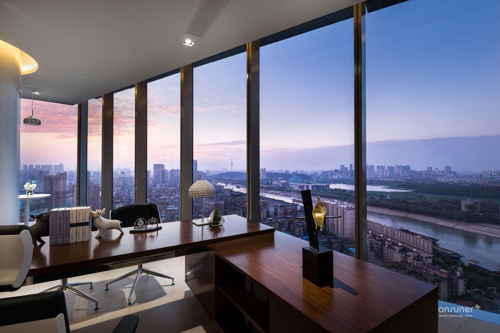 在偌大的办公区内,有一半墙面为落地窗,近见轻轨一号线蜿蜒向北,远眺龟山电视塔、长江大桥、黄鹤楼等,汉江十景,尽收眼底。故除布置了办公家具外,同时靠窗位也放置了形态各异的休闲椅,让上班族在工作之余可一览旖旎江景,放松身心。