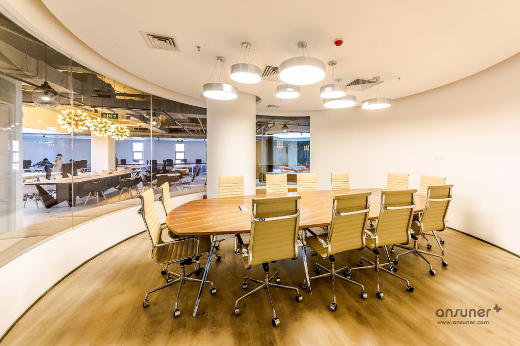 圆弧形的会议室和休闲区是本次设计的核心,也是凸显共享和交融的重点,通透的玻璃会议室和无遮拦的休闲区设计形成完美的结合。休闲区的设计得益于当今的科技发展,移动式办公成为可能。标注办公桌渐渐转化为共享办公桌,多元化的移动办公方式提供了更丰富的选择。个人固定办公桌时代已经成为过去,员工要考虑的事情就是选择哪里更合适今天的心情、今天的工作。