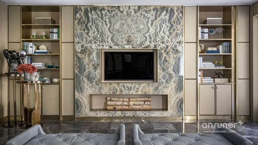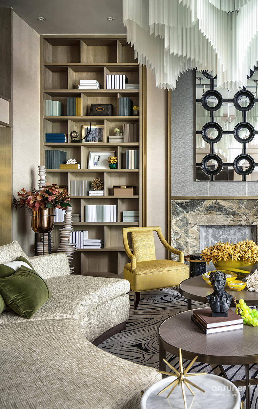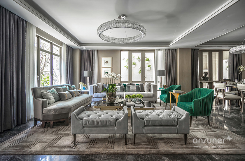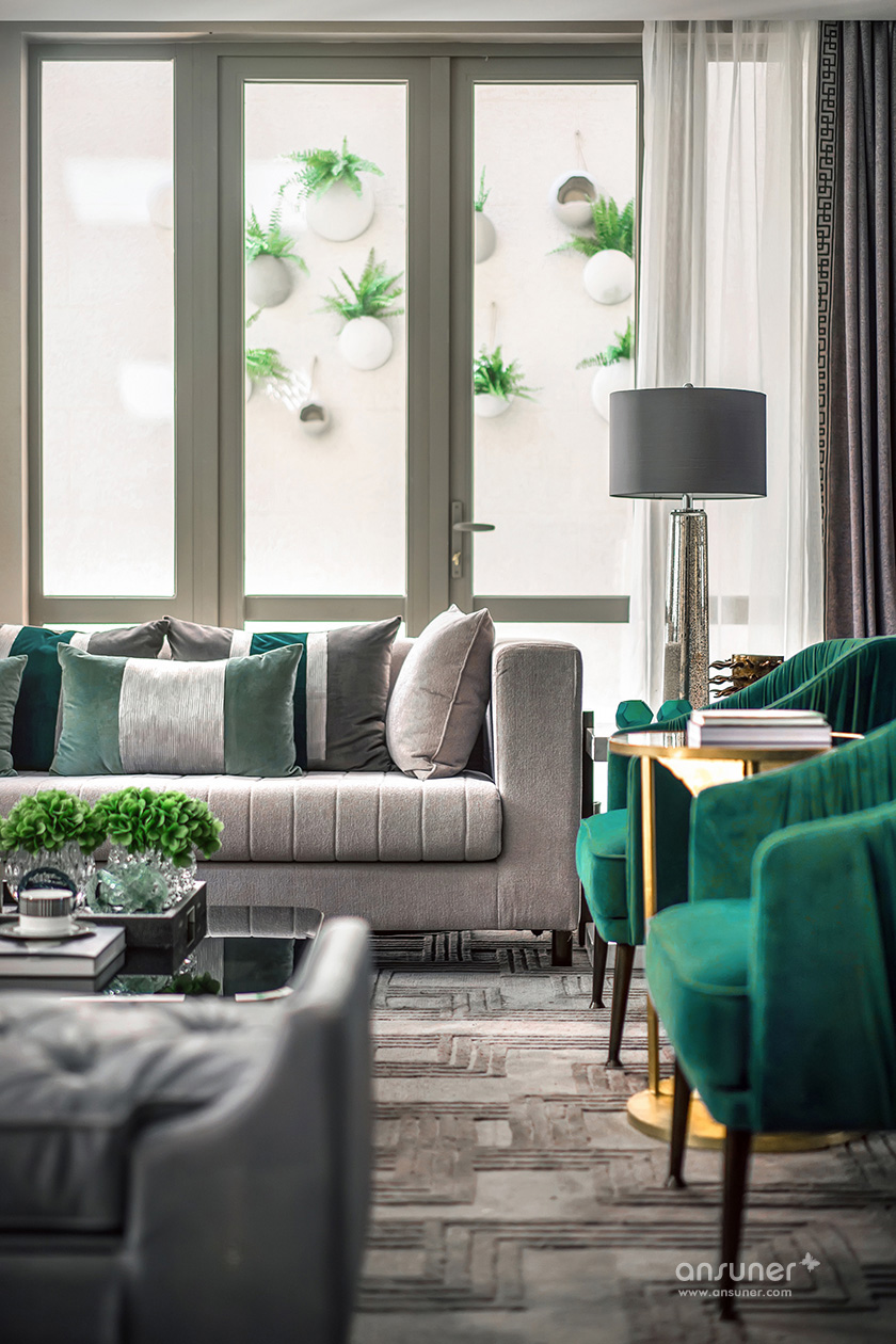 “在我看来,文化的自信与东方设计的回归,不应该仅仅停留在符号、图案、款式、线条的表面异变......甚至,在艺术与审美上,东方和西方并非泾渭分明的。”她说:设计以玉石之王翡翠的色彩,应用于灰色的主调空间,以丰富的家居配饰元素、鲜明的色彩层次及质感的材料运用,呈现了浪漫、灵动的空间之美,让这个五层的别墅呈现了绝美风华。