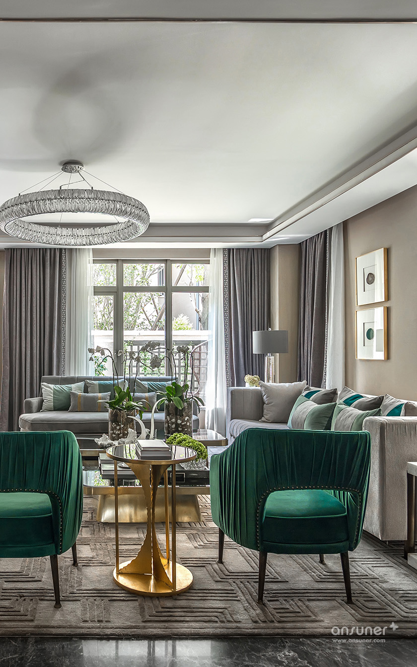客厅与餐厅的设计中,高贵的气质在祖母绿与高级灰结合的刹那占领整个空间,在温润如玉的质感与盈透的色泽中,彰显着无与伦比的诱惑魅力。 她说:我想要让身处其间的人,在妙曼的视觉感受之后,发现有某些元素能够触碰我们内心的原点。