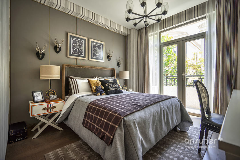 男孩房以精致的格纹与几何线条的延伸界定了空间的格调,欧洲建筑图案为背景的单椅和精心布置的艺术品,让空间更具情景化,纯真浪漫。